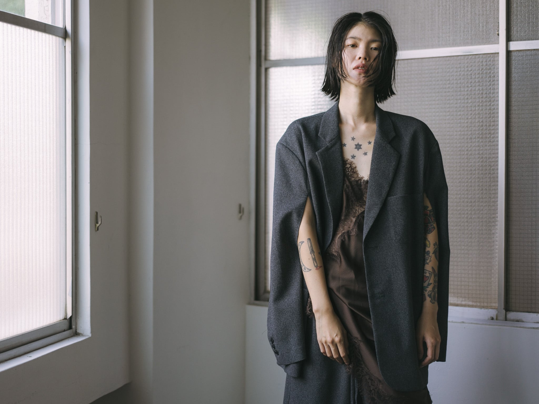 リネンのジャケットにありがちなシワを気にすることなく着てもらえるよう生地を選びました。 ばさっと羽織るだけで様になるオーバーサイズなシルエットはオケージョンにはもちろん、ピクニックにも着ていただけるような少し肩の力をぬいて着れるデザインに拘りました。 お袖にはスラッシュあきを入れており、腕を出しで着用いただけるので、肩がけですぐズレてくる方にもおすすめの着方です。
