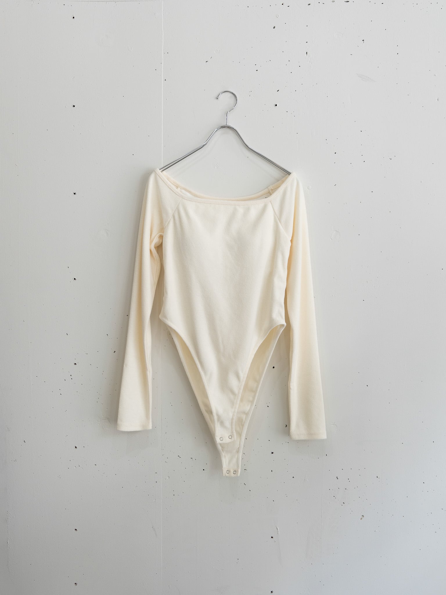ベルベットような目の細かいパイル楚材を採用したボディースーツ。 オフショルダーでかつボディースーツですが、パイル楚材なのでカジュアルに着ていただけます。 デコルテ部分をすっきりとみせてくれるように 首周りを何度も調整しました。 シンプルですが、存在感があり着回しのきく1枚です。