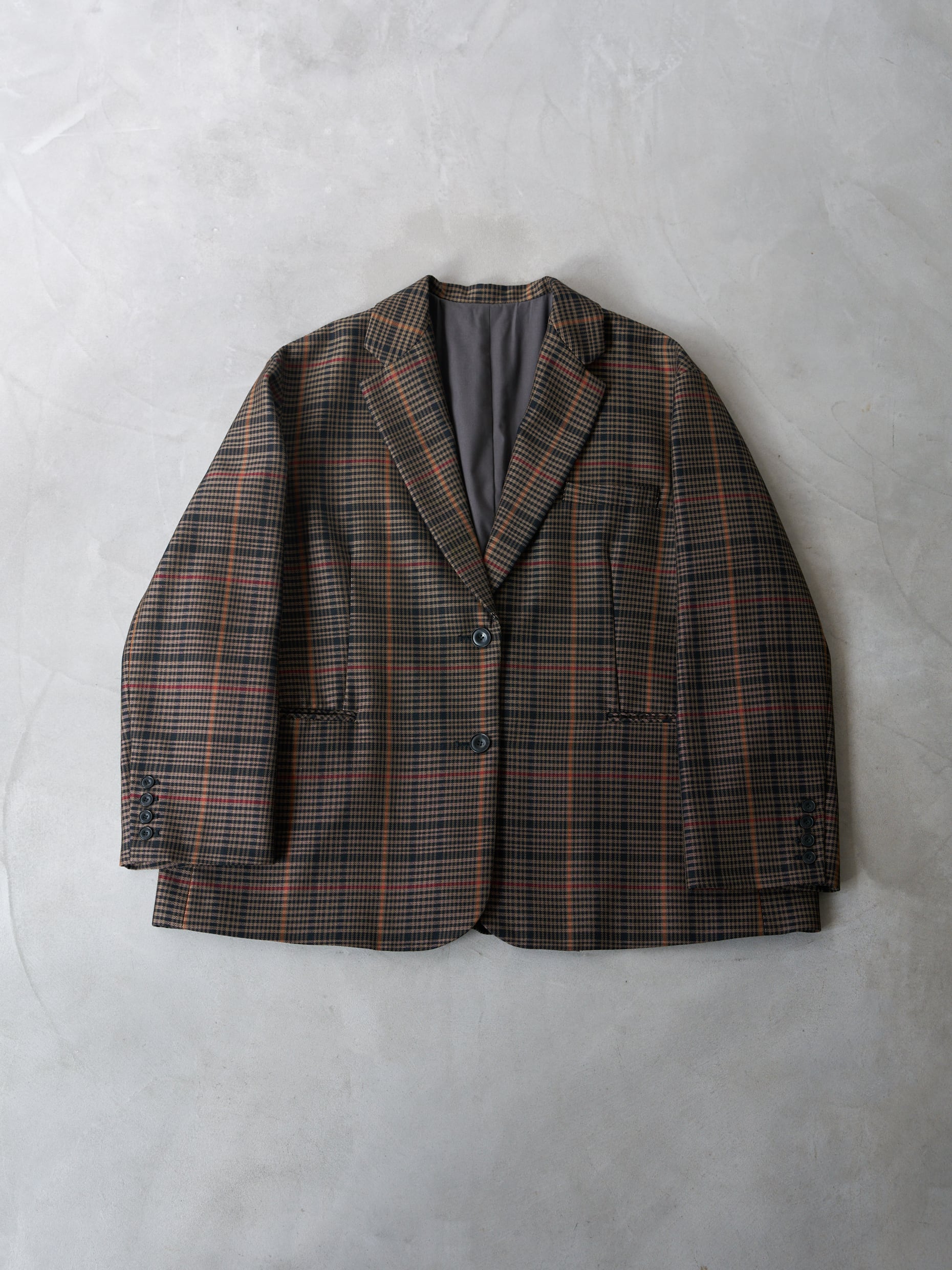 タテ糸にオーストリアの厳選された羊毛を紡績したウールを4本撚り、ヨコ系にはポリエステルのウーリー加工糸をしようした国産のドライタッチな生地を採用したオーバーサイズのジャケットです。 何よりチェックの柄が可愛く、生地の風合い共に一目惚れした生地でした。 ハリ感があり、シワになりにくく、ばさっと羽織るだけで様になるメンズライクなシルエットにはなりますが、シングルボタンでフロントはスッキリと仕上げ女性らしさも。