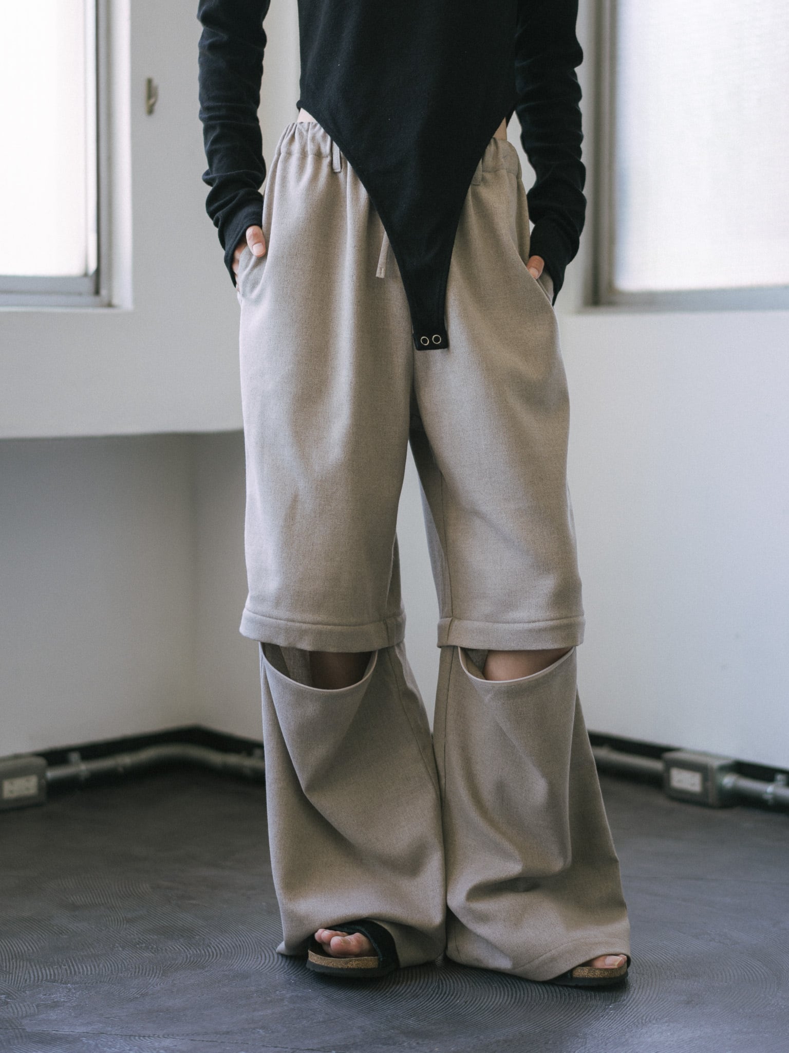 2色の異なる糸をインターレースしたスラブ調の糸を先染めで織り上げることで、リネンの亜麻色を表現した国産生地を採用しましたイージーパンツです。 部分を外すとショートパンツになるデザインで ショートパンツの丈は膝が出ない丈感に拘りました。 半分あけてタイツやソックスを覗かせて履いてもらうのも素敵です。 ウエストの仕様はゴムとドロストリングでリラックスして履いていただけます。 ベルトループもつけているので、ベルトをしてもらっても◎