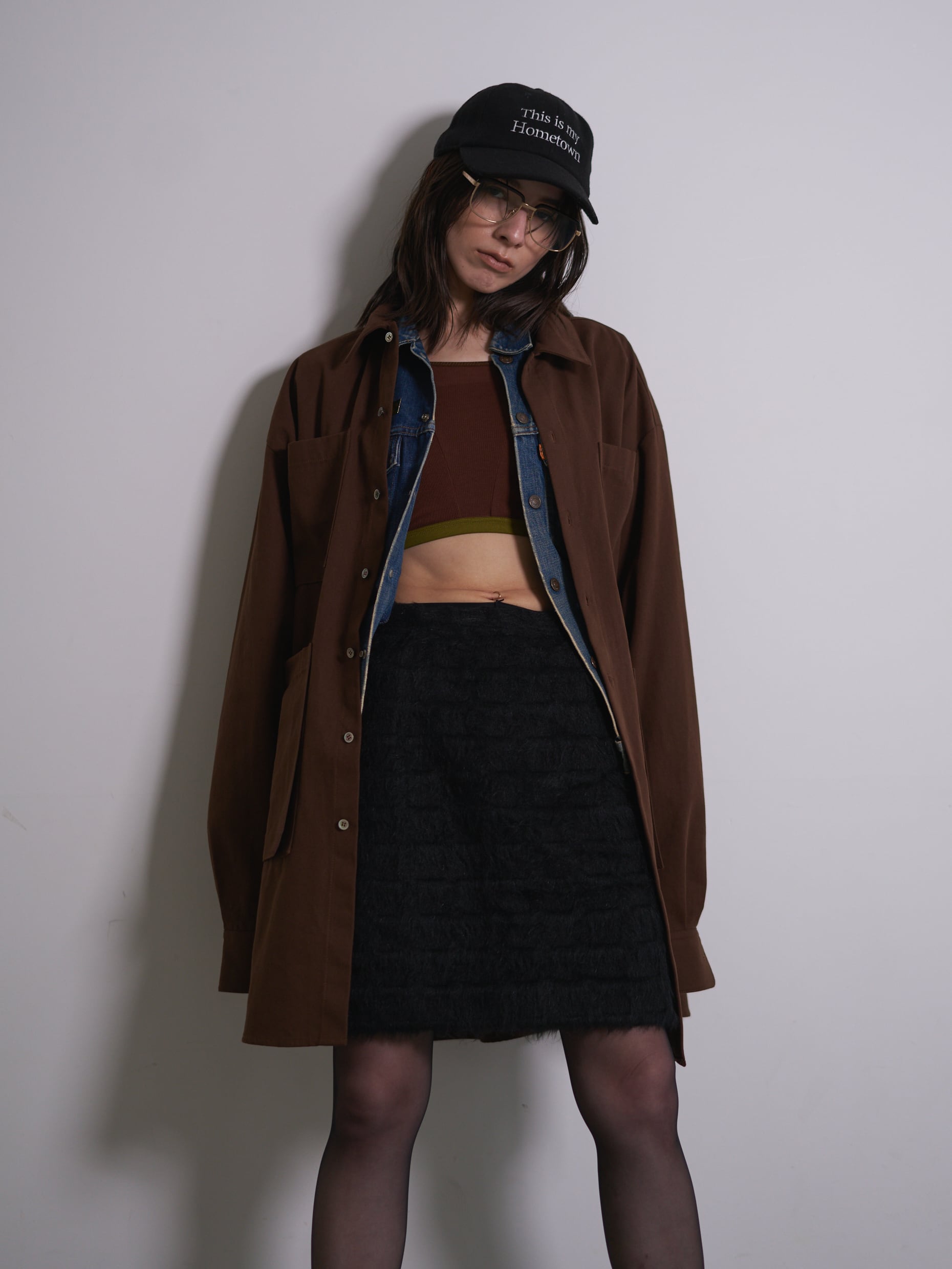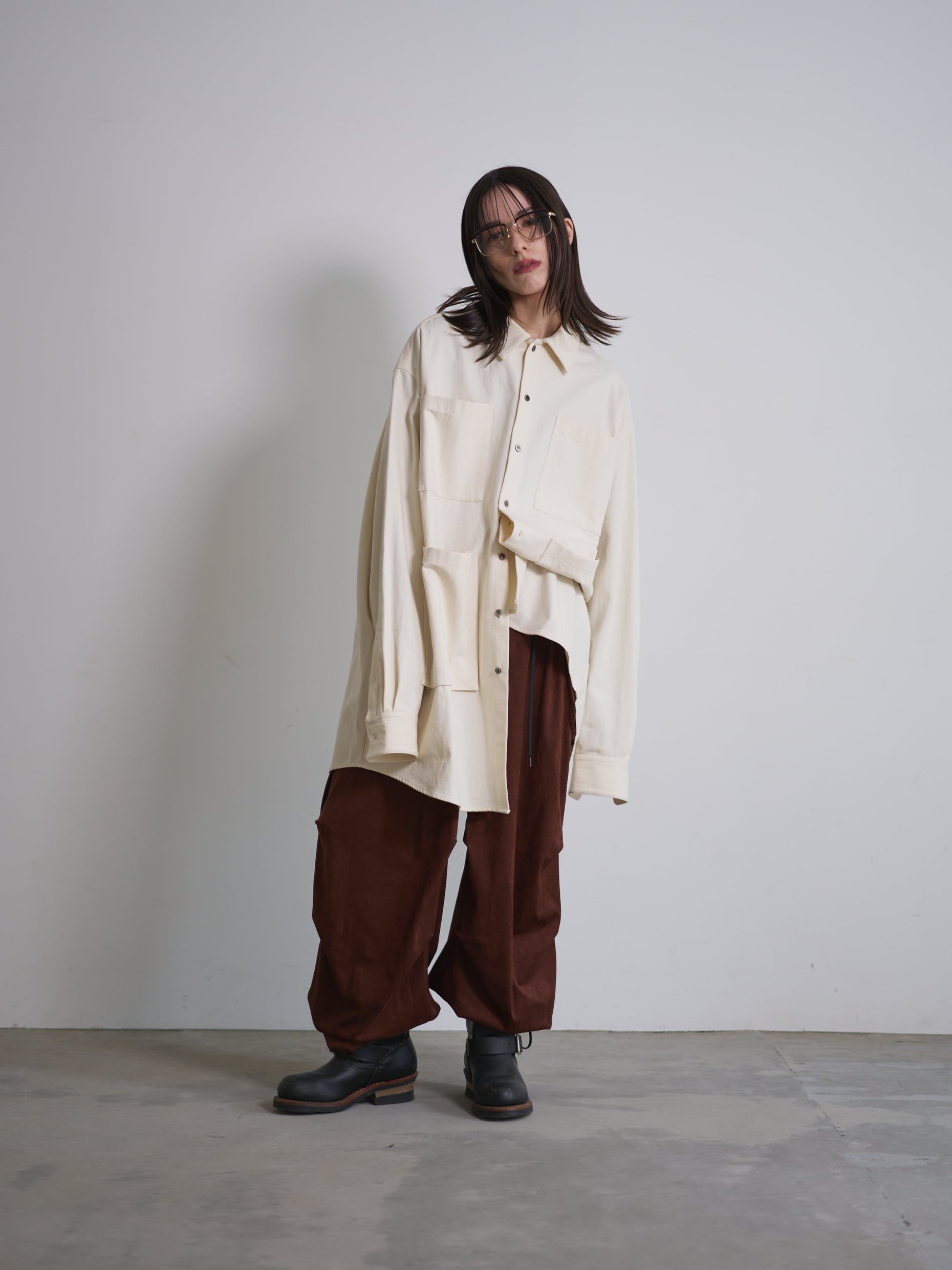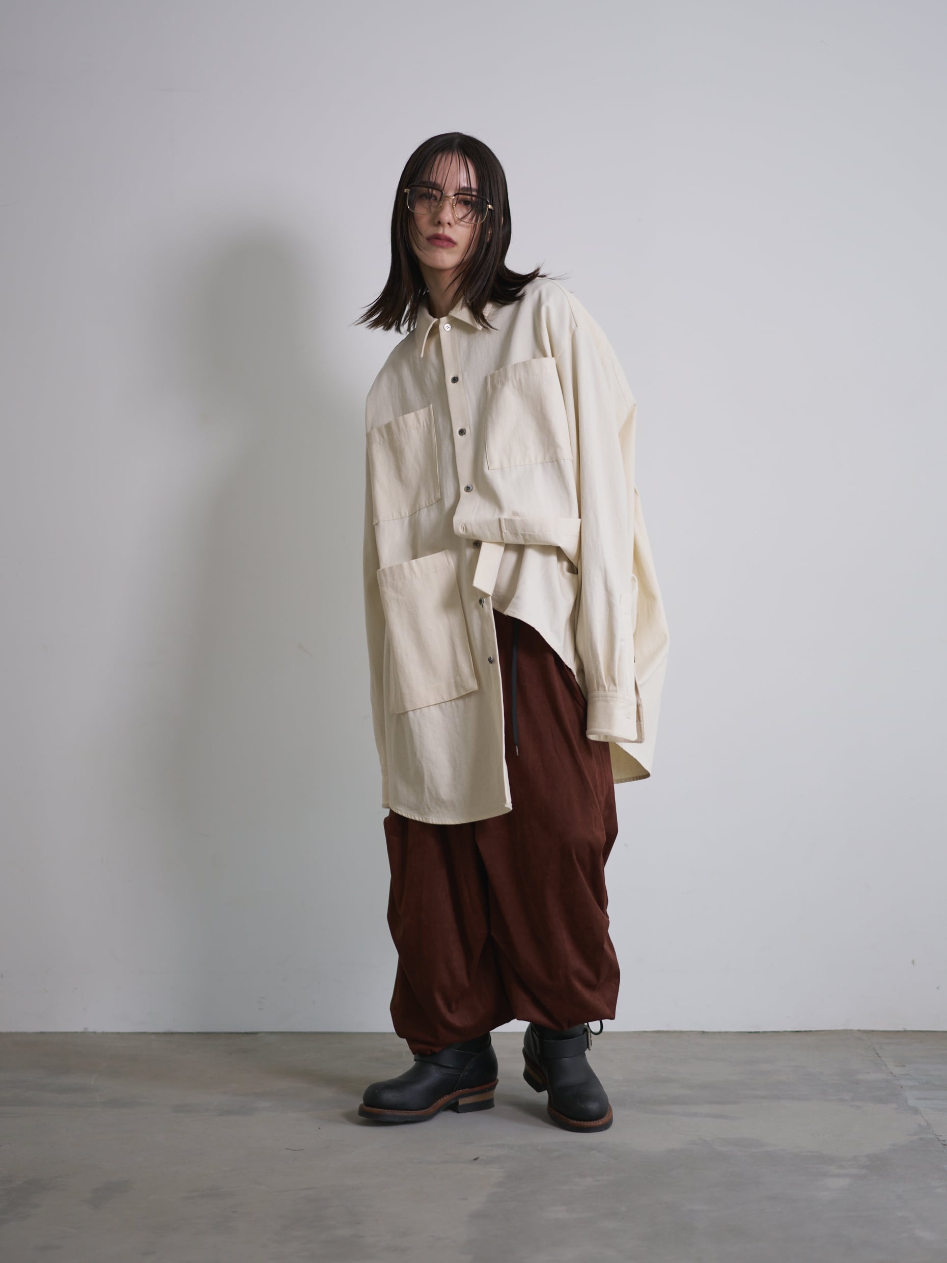 身頃はしっかりサイズを出していますが、お袖は見頃に対して少しスッキリ目のサイズ感にしており、オーバーサイズですが、スッキリとモードにも着てもらえるようなサイズ感に拘りました。