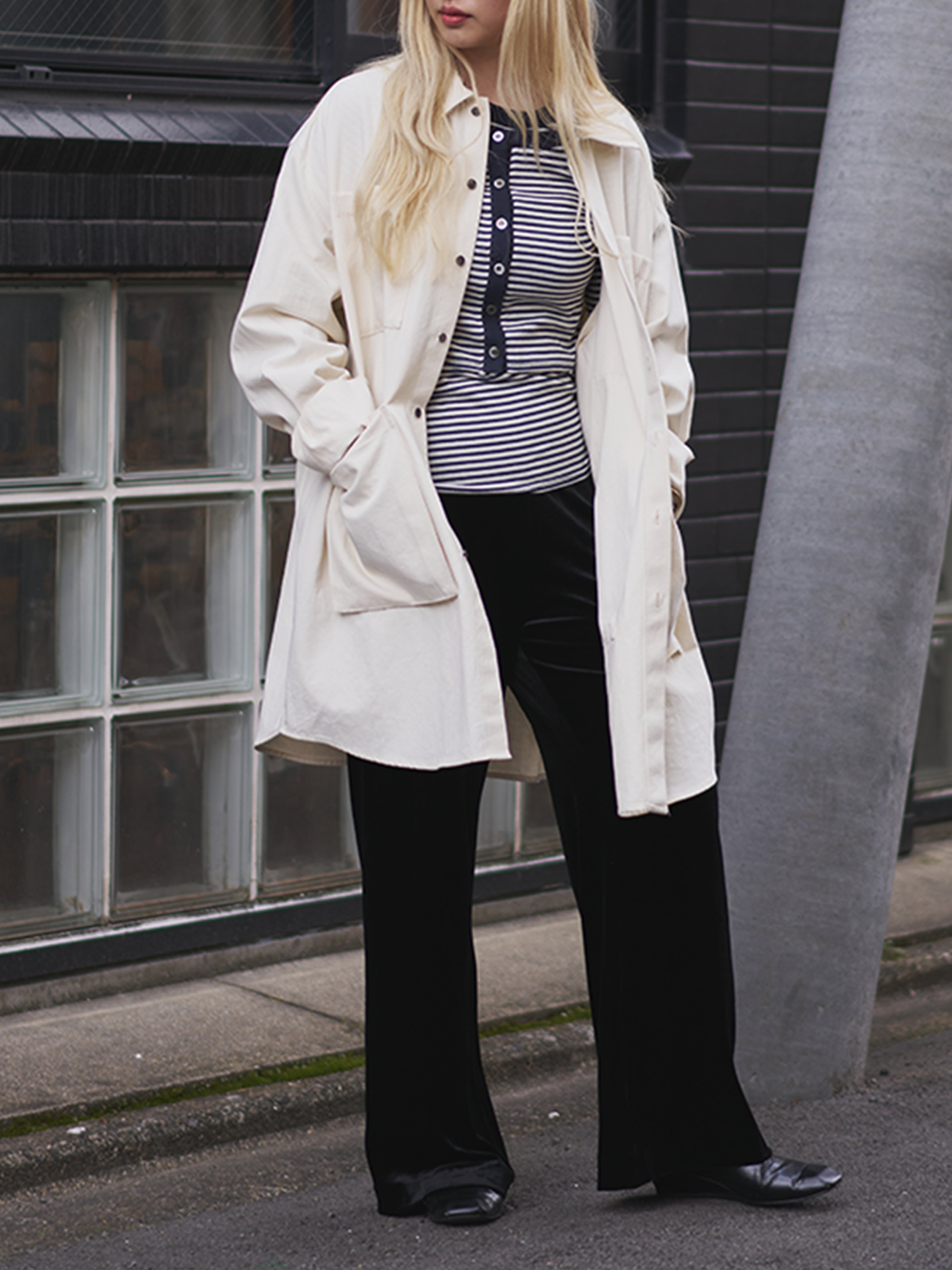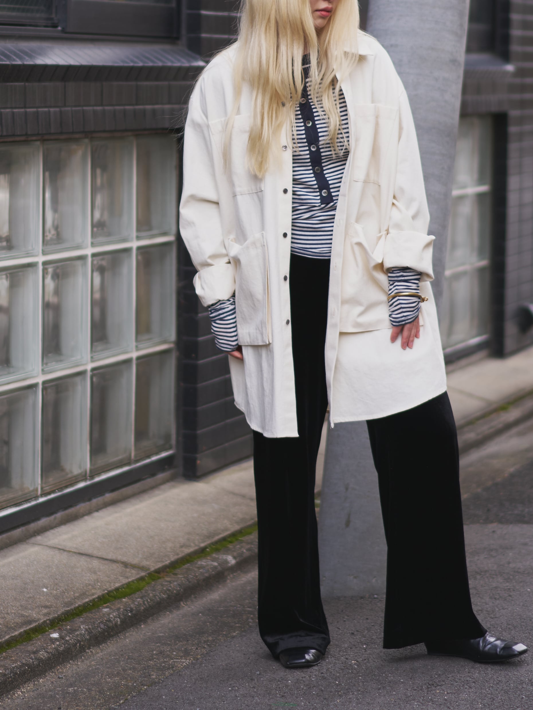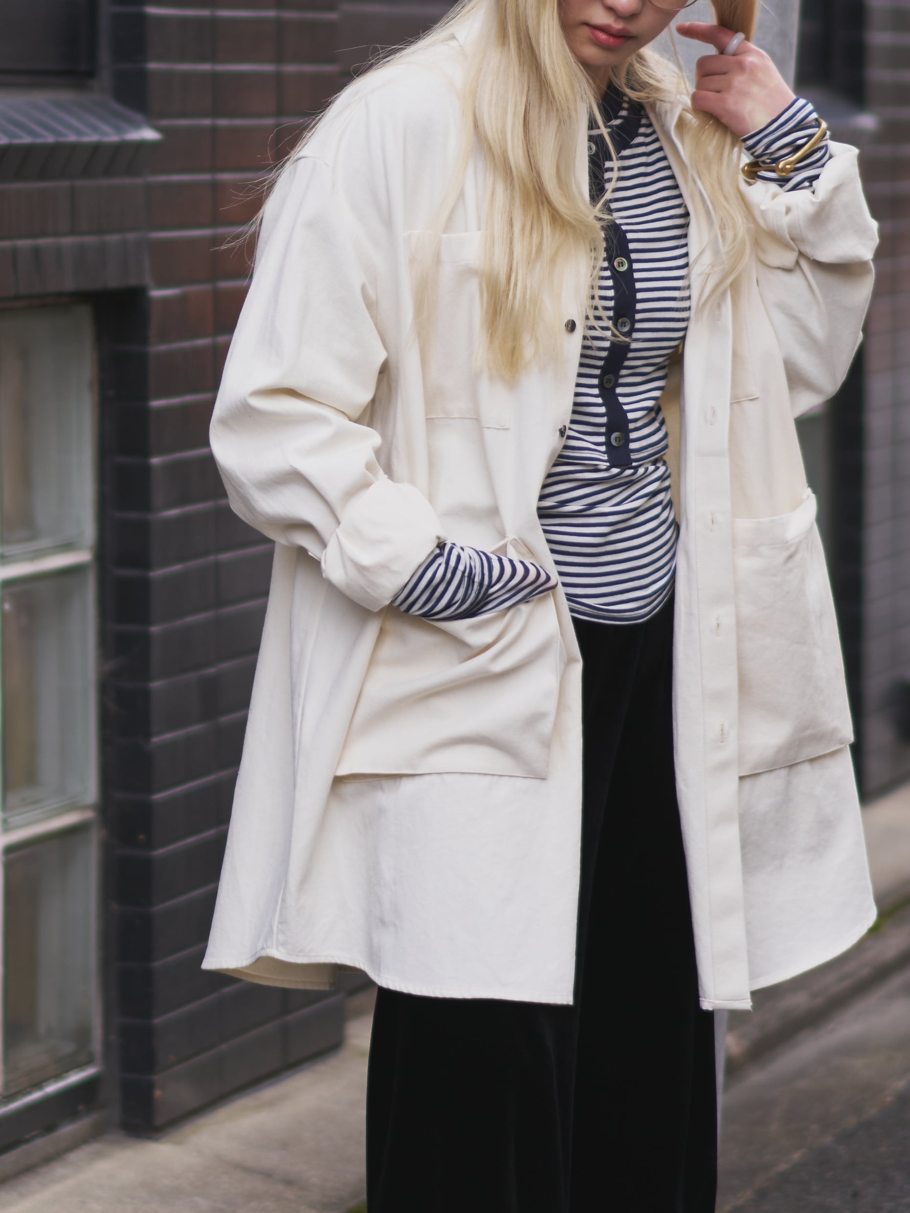 身頃はしっかりサイズを出していますが、お袖は見頃に対して少しスッキリ目のサイズ感にしており、オーバーサイズですが、スッキリとモードにも着てもらえるようなサイズ感に拘りました。
