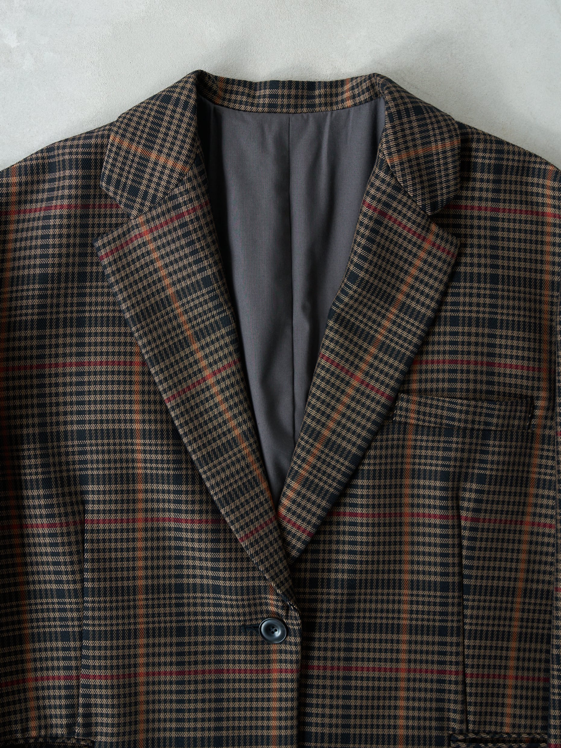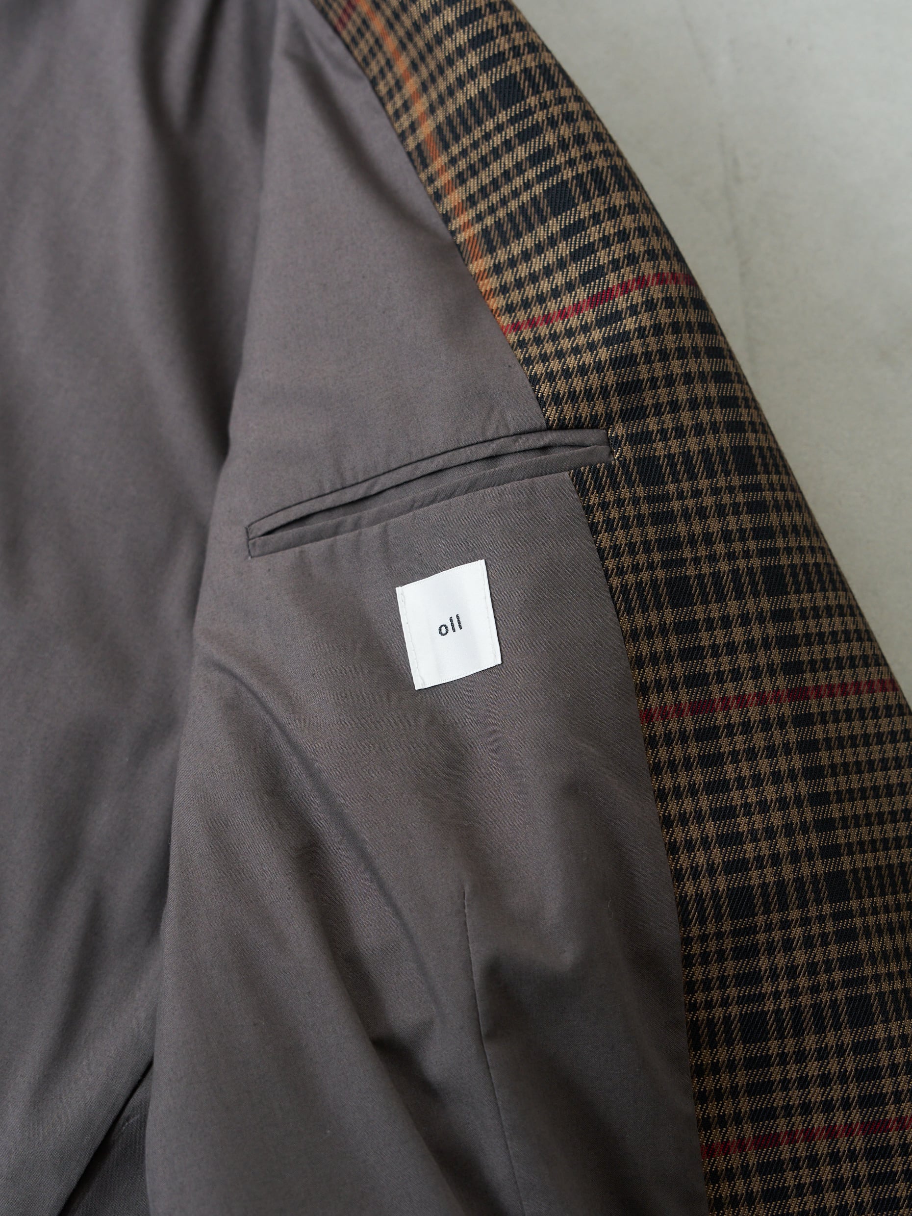 タテ糸にオーストリアの厳選された羊毛を紡績したウールを4本撚り、ヨコ系にはポリエステルのウーリー加工糸をしようした国産のドライタッチな生地を採用したオーバーサイズのジャケットです。