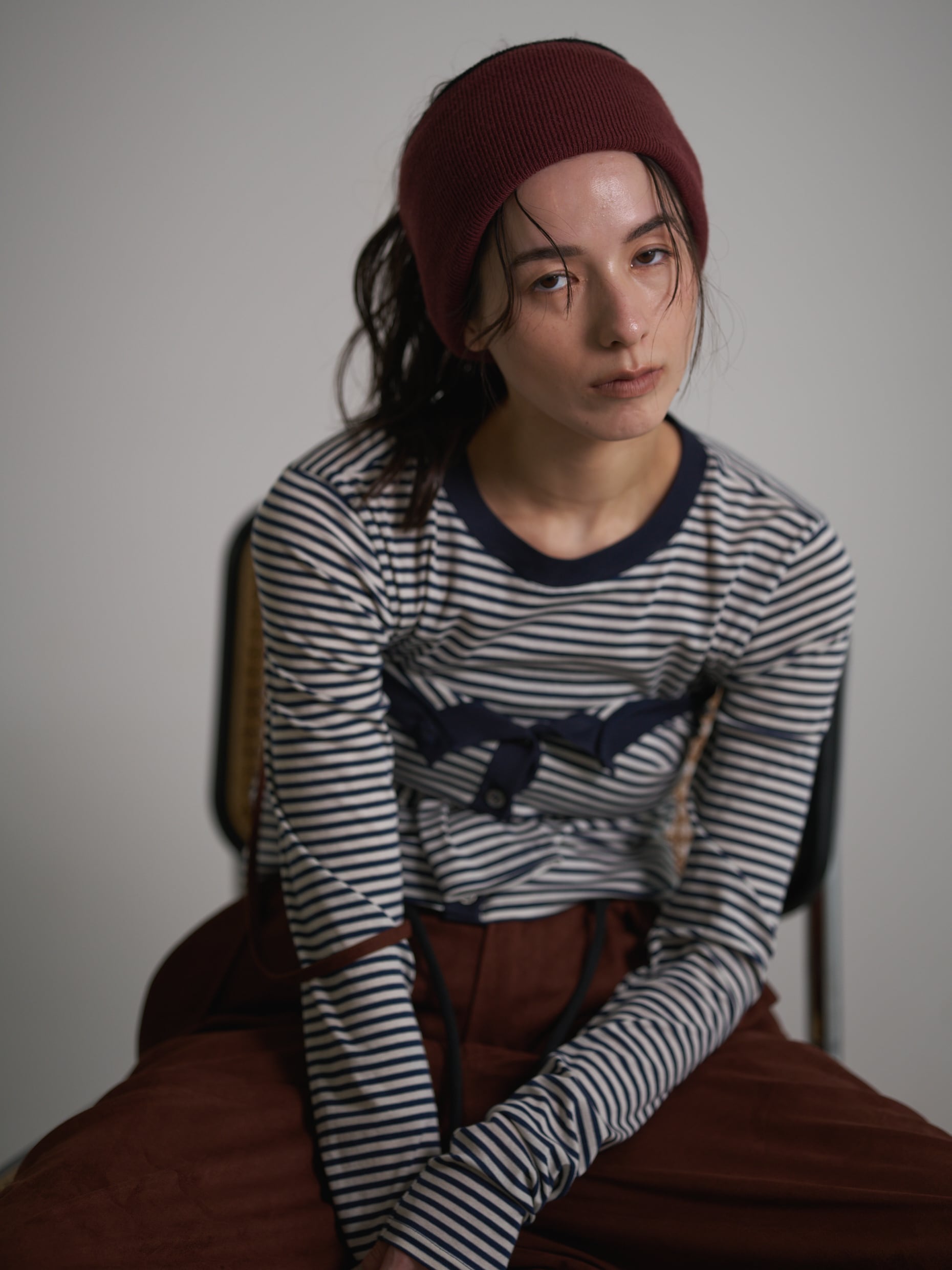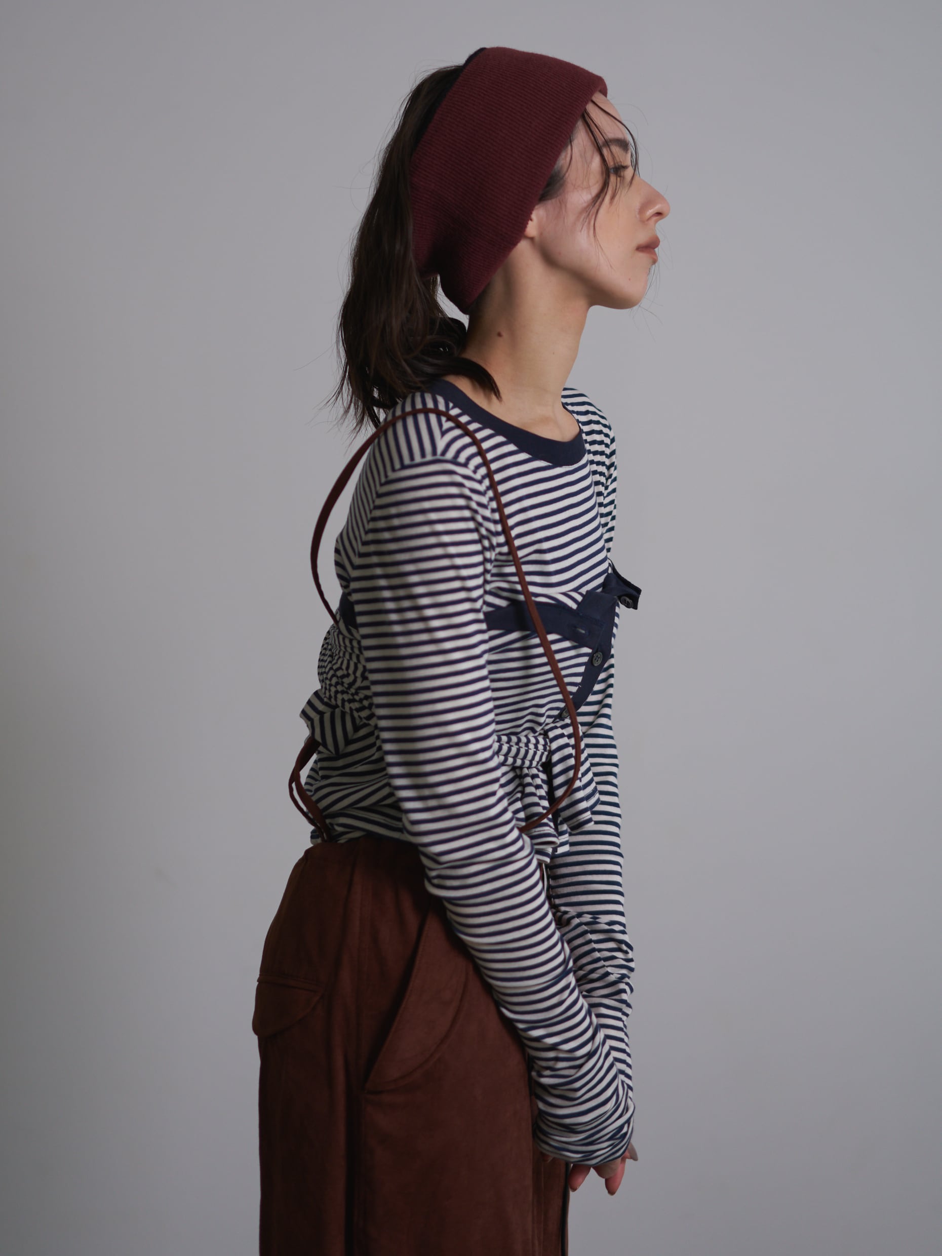 カーディガンの胸元をあけてお袖を通さずに胸元で縛ってビスチェのような着方もおススメです。
