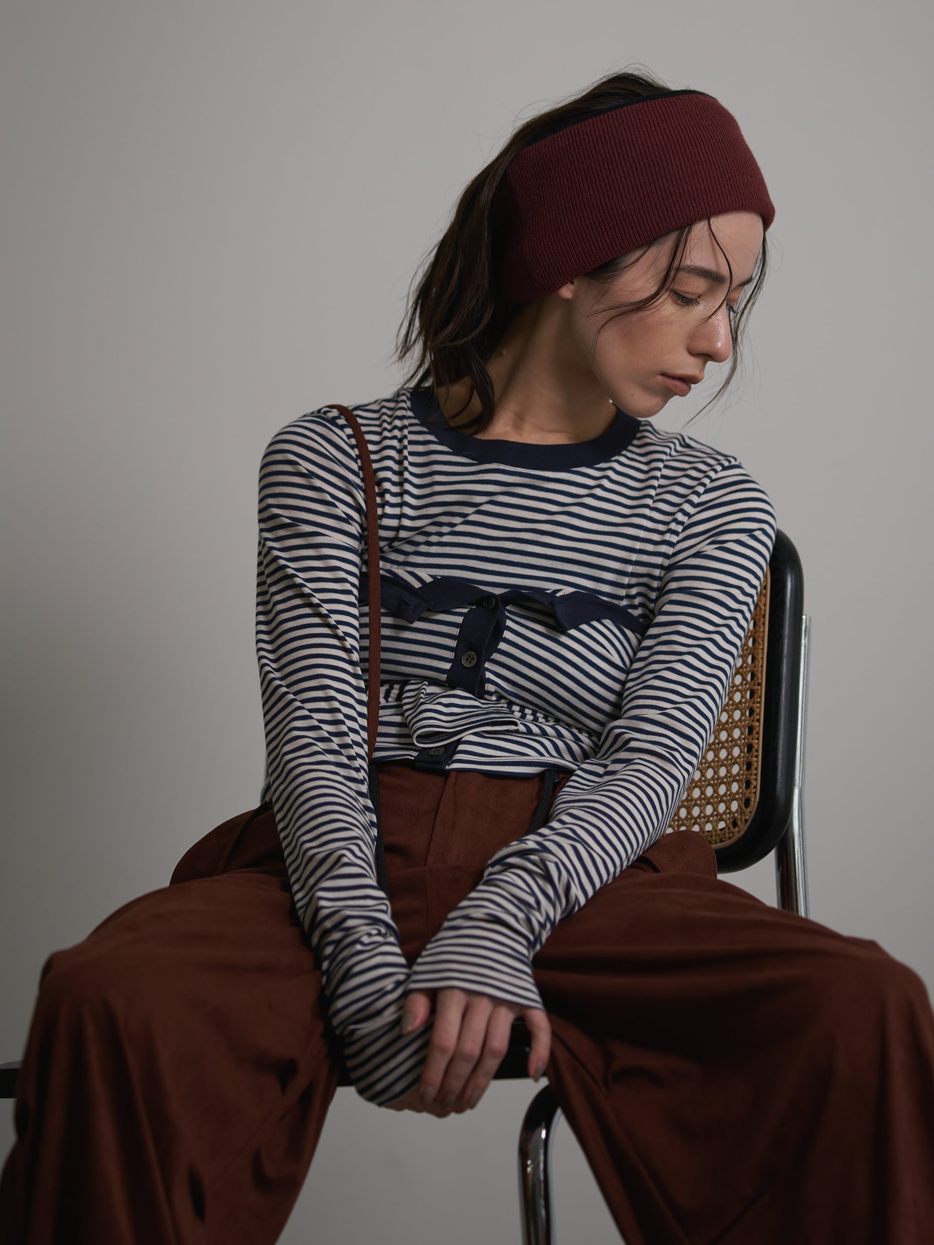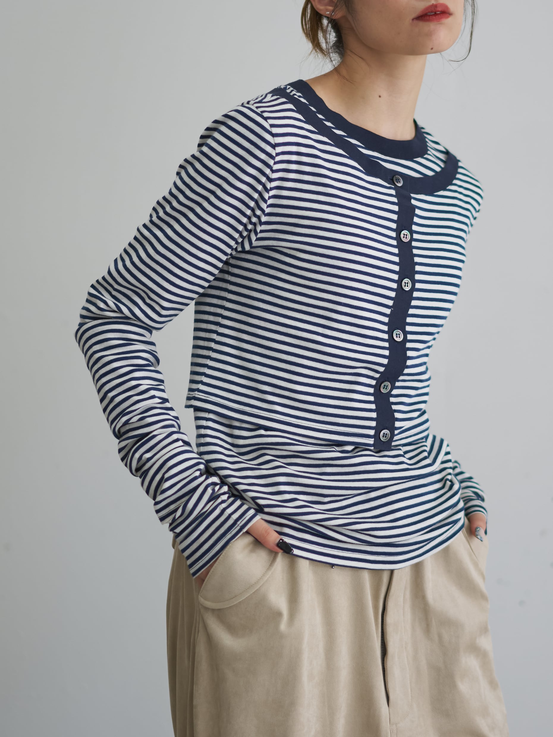 プルオーバーとカーディガン共に生地に伸縮性があるのでコンパクトなサイズ感に仕上げており、レイヤードしてもゴワゴワせずに着て頂けます。