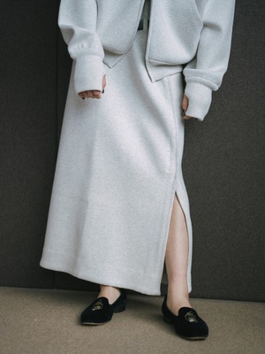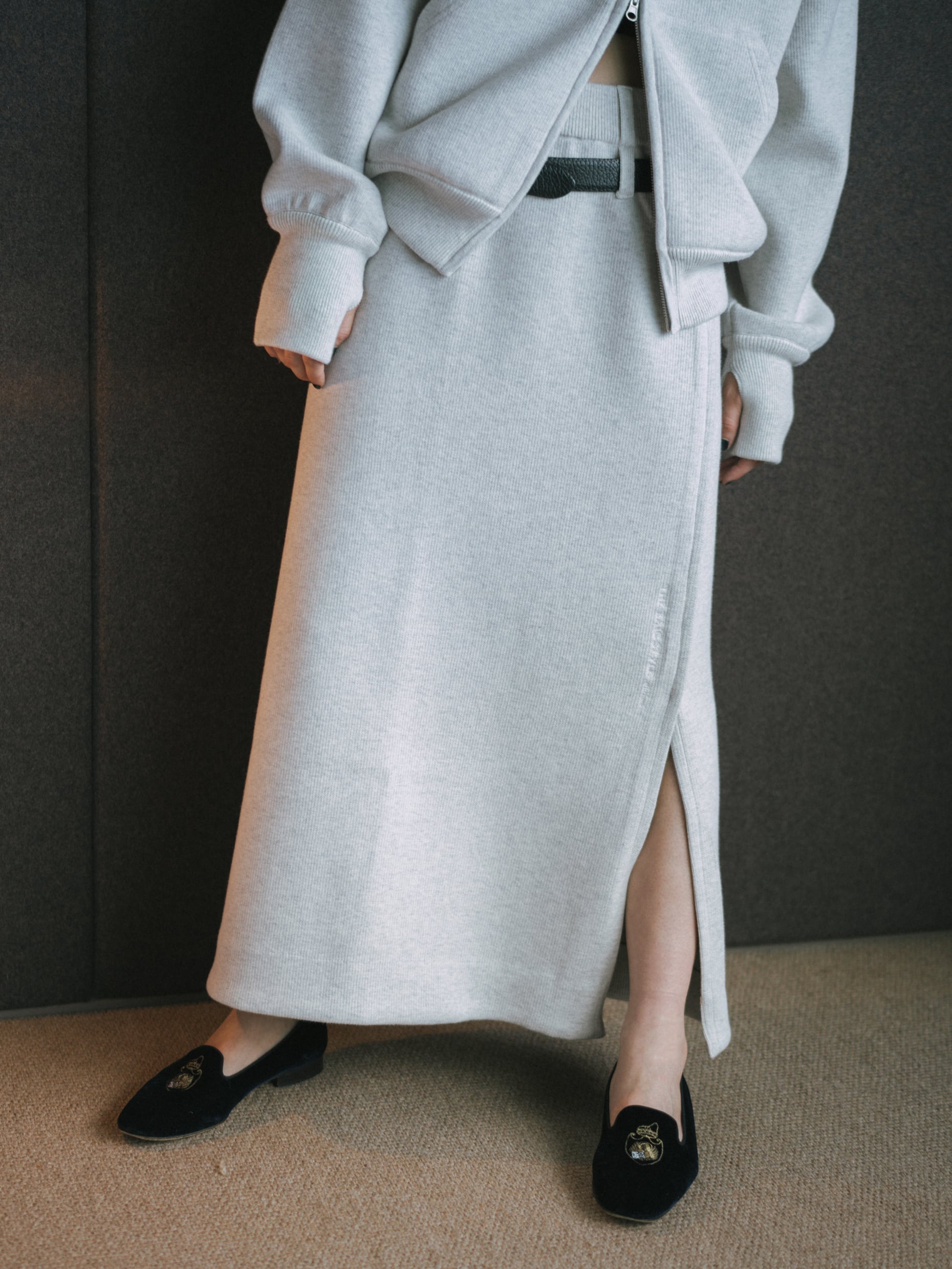 ボックス形のスカートはスリット位置を自由に決めて着用いただけるので、その日のコーディネートに合わせて調整してお楽しみいただけます。