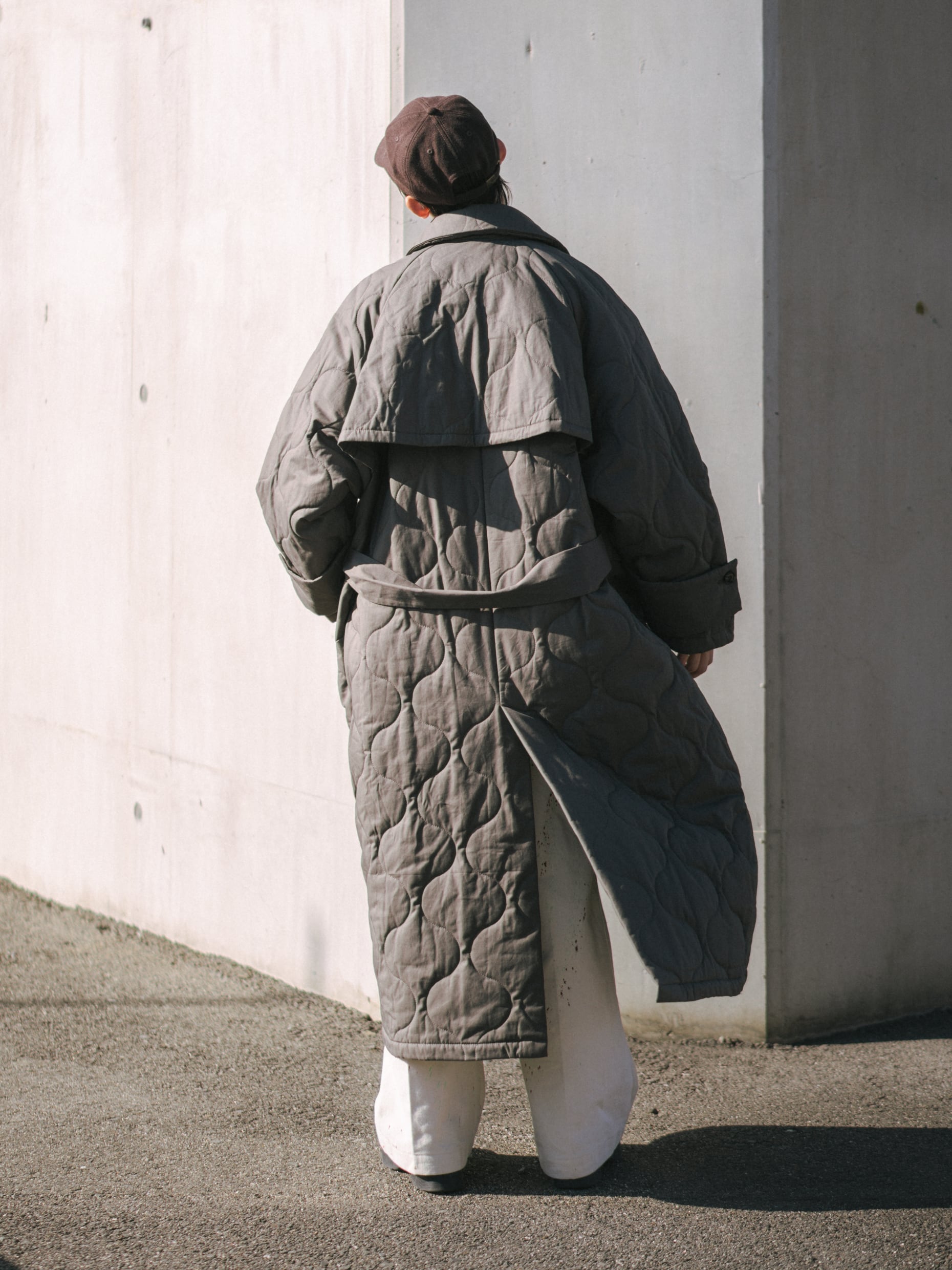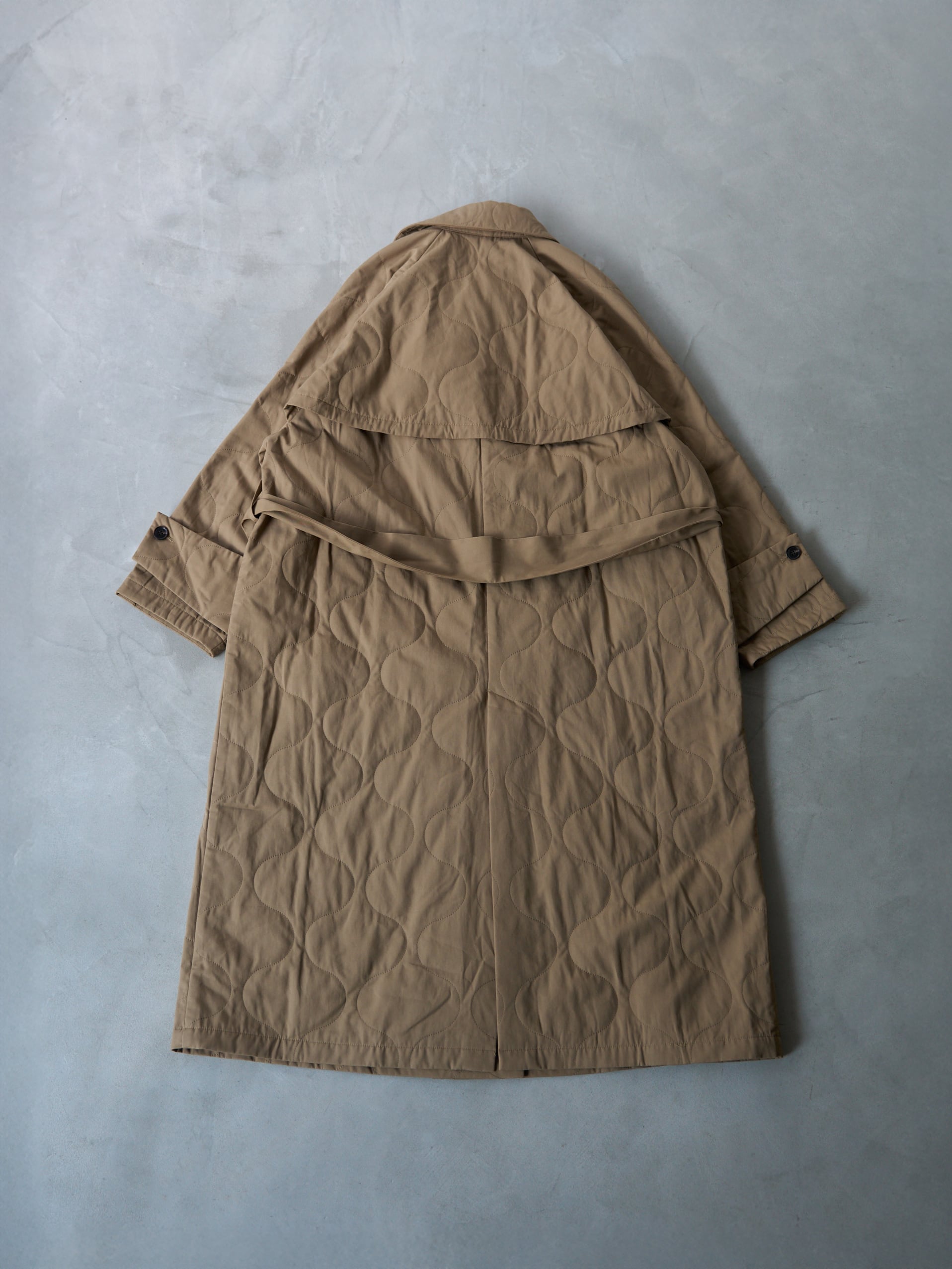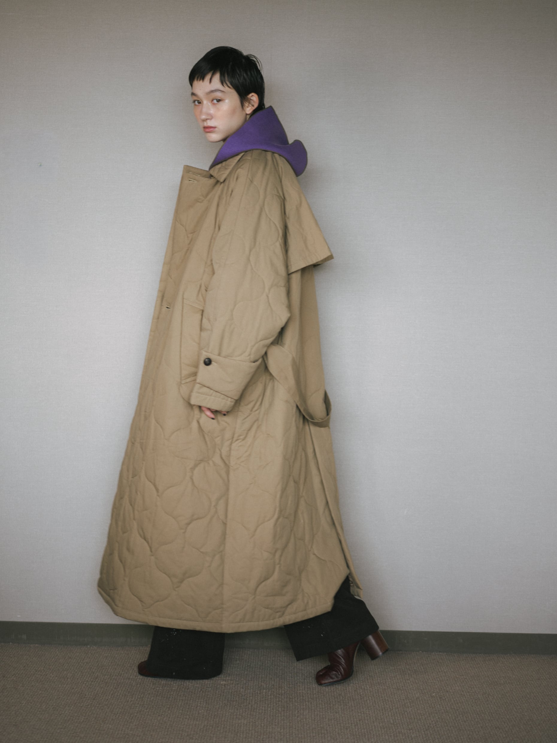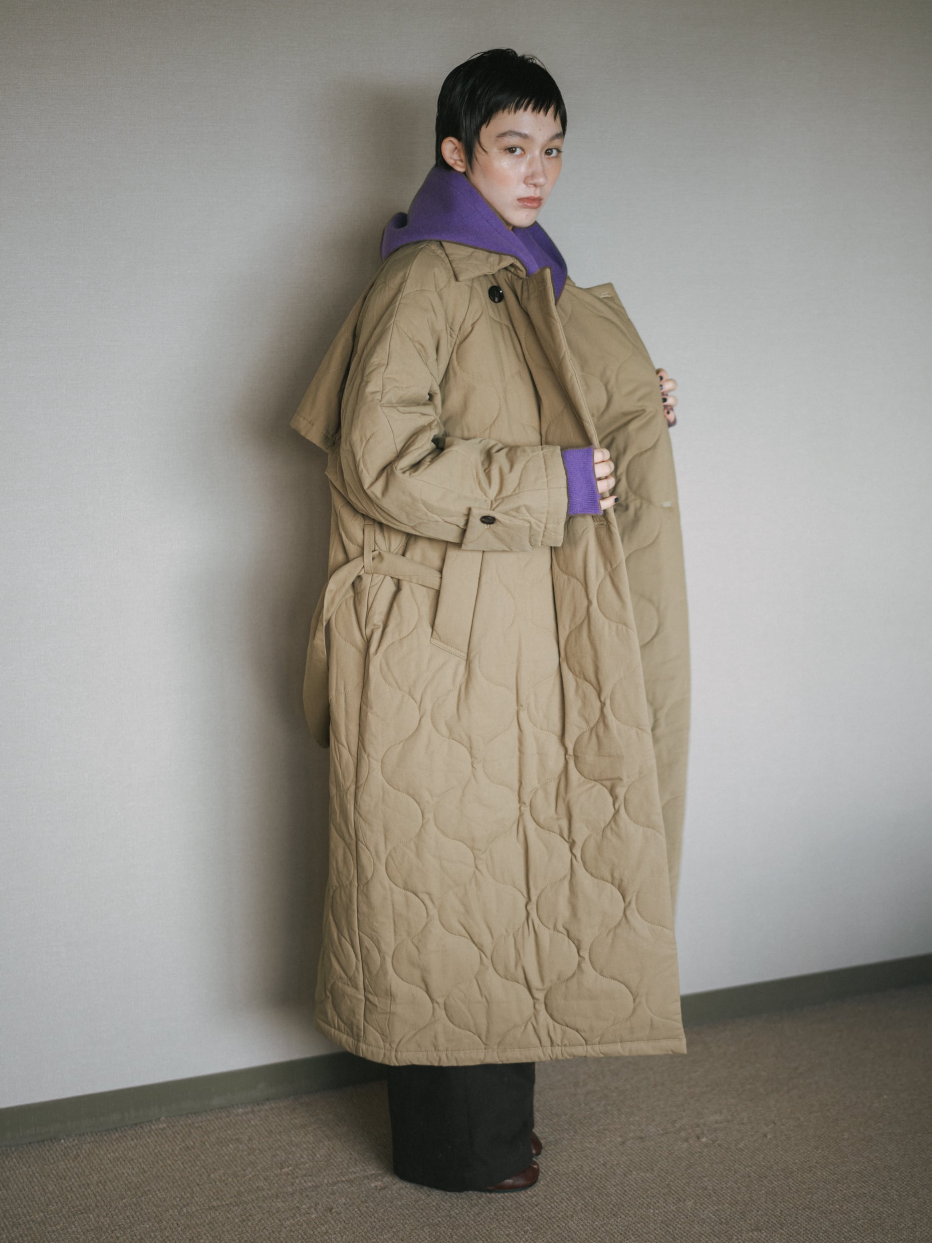 テンセルコットンの生地を使用した中綿のキルティングトレンチコートです。シルクのようななめらかさとコットンのカジュアルな風合いの両方を楽しめる生地を採用しました。