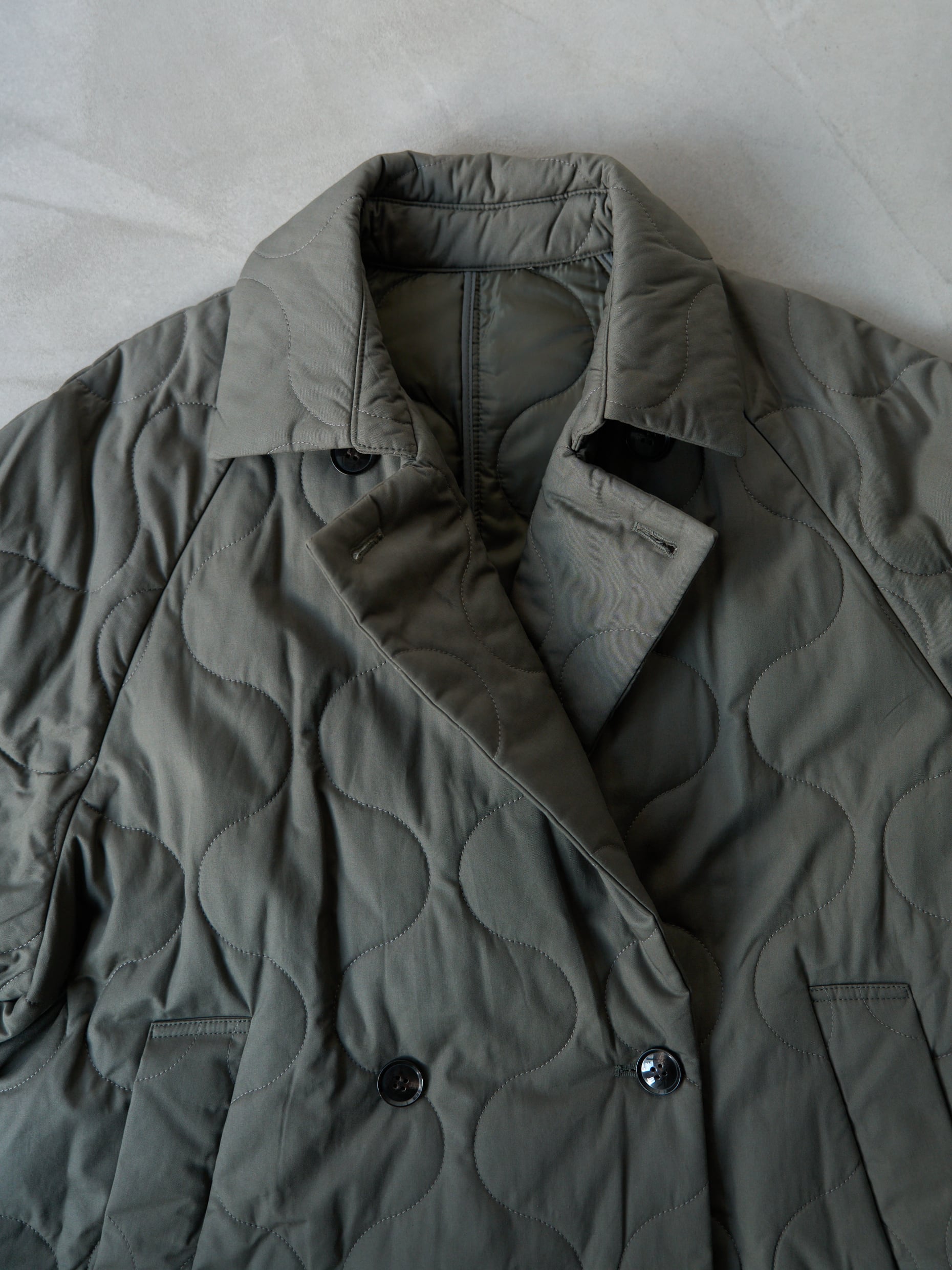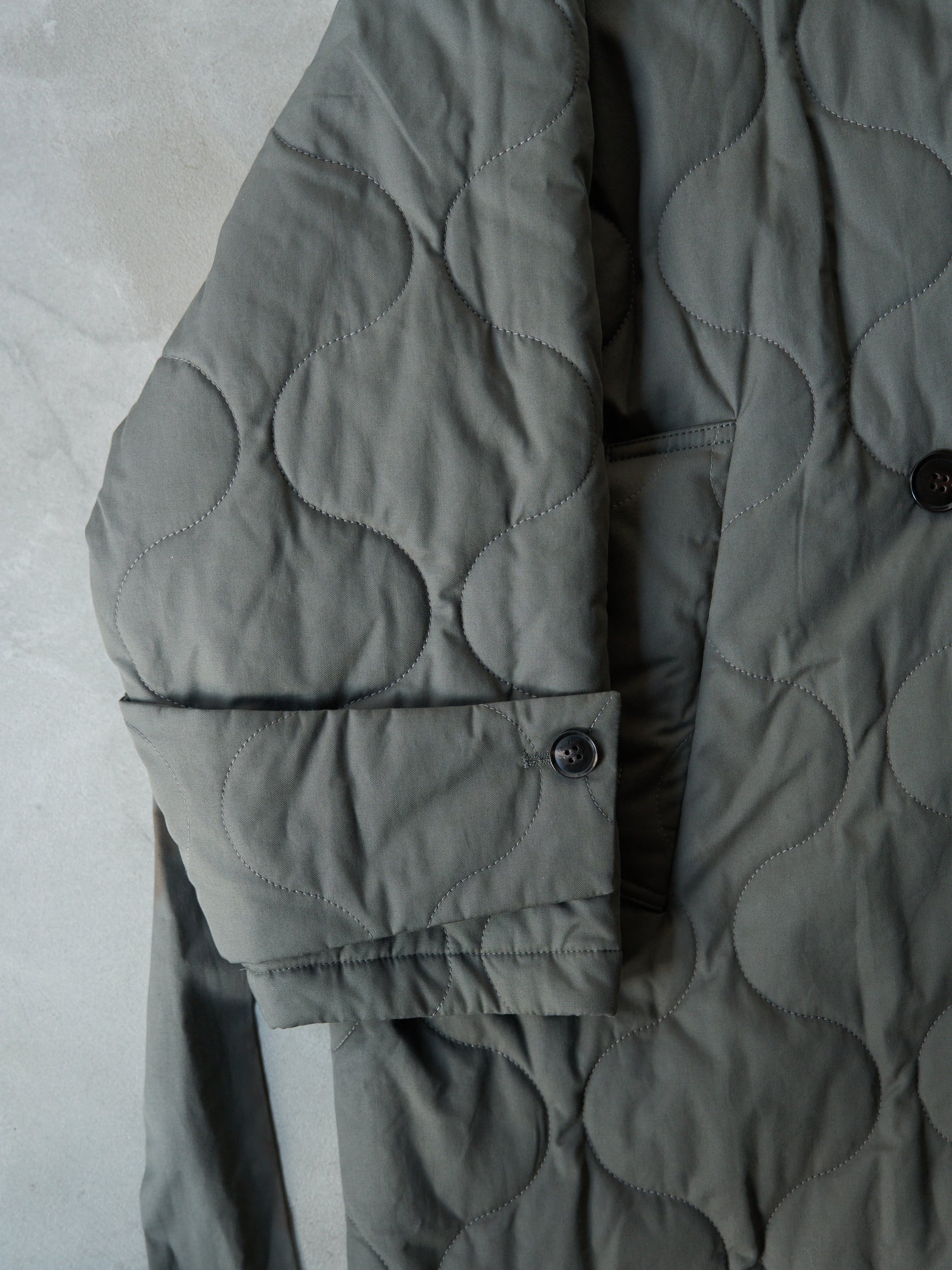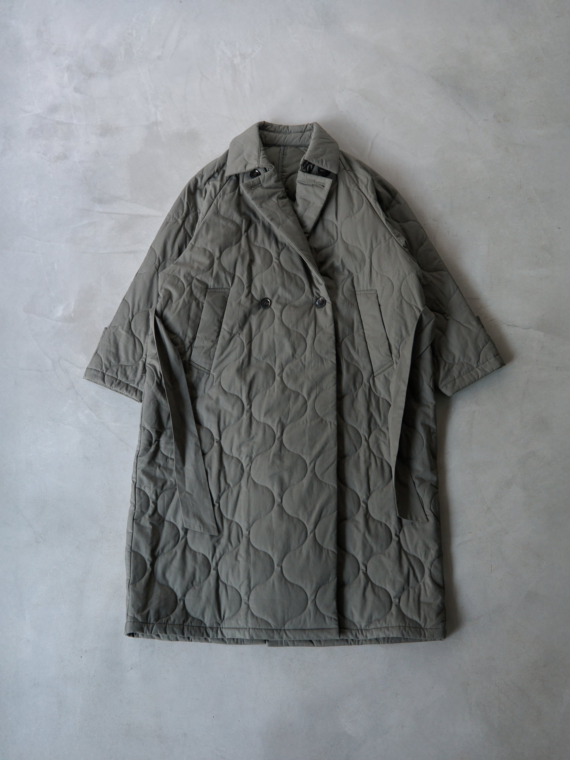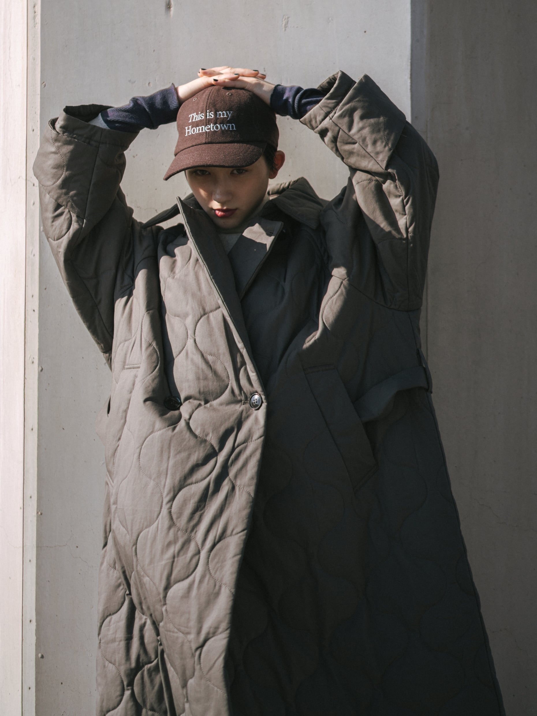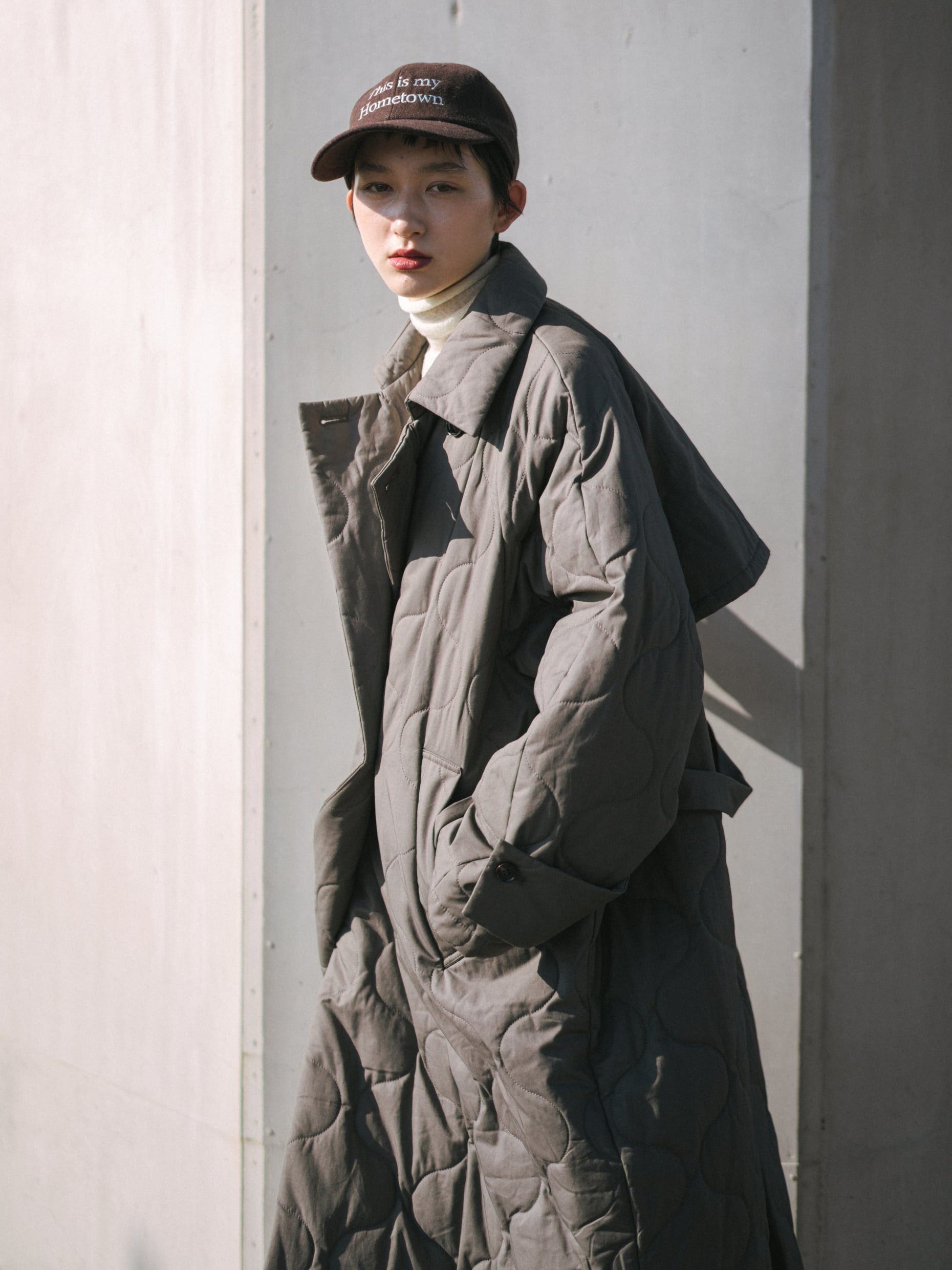 テンセルコットンの生地を使用した中綿のキルティングトレンチコートです。シルクのようななめらかさとコットンのカジュアルな風合いの両方を楽しめる生地を採用しました。