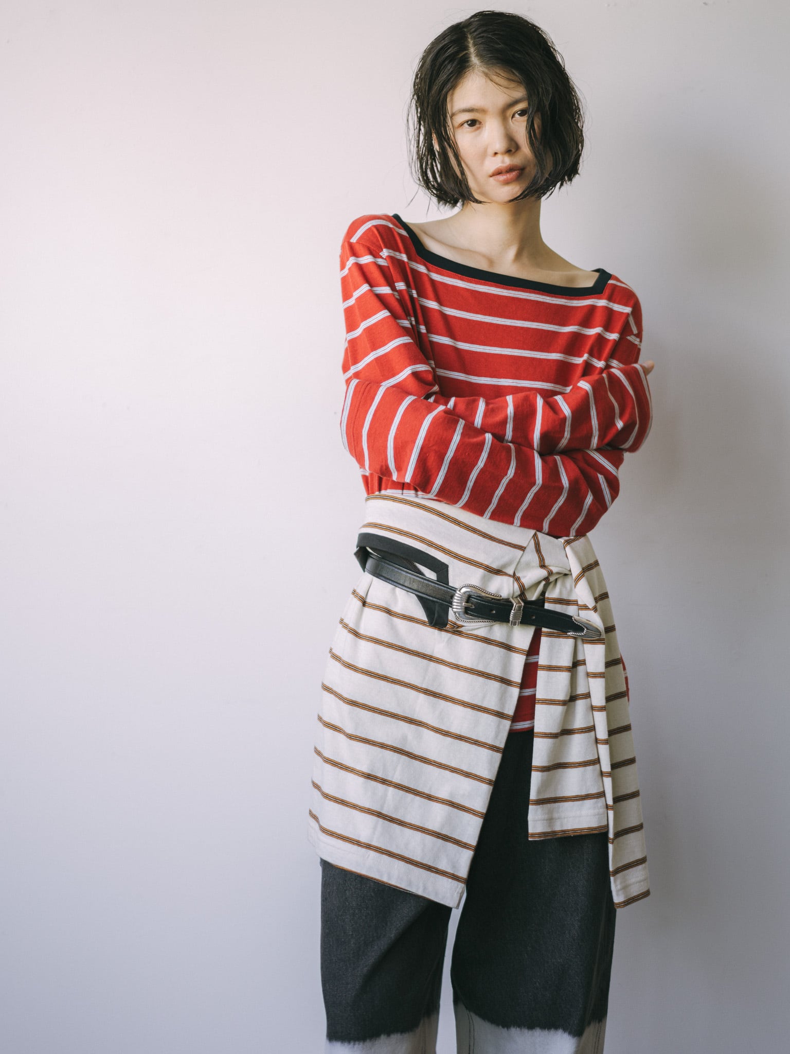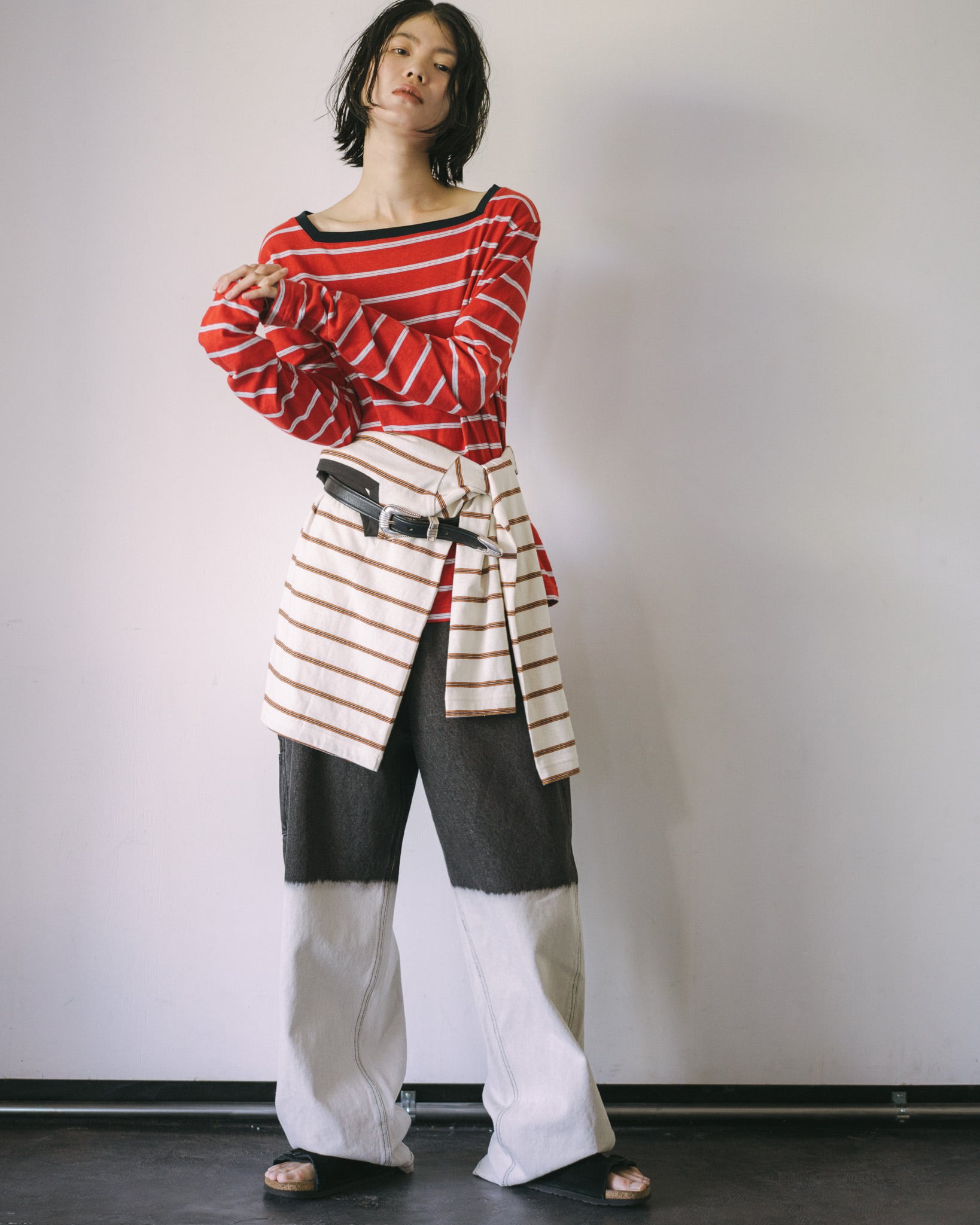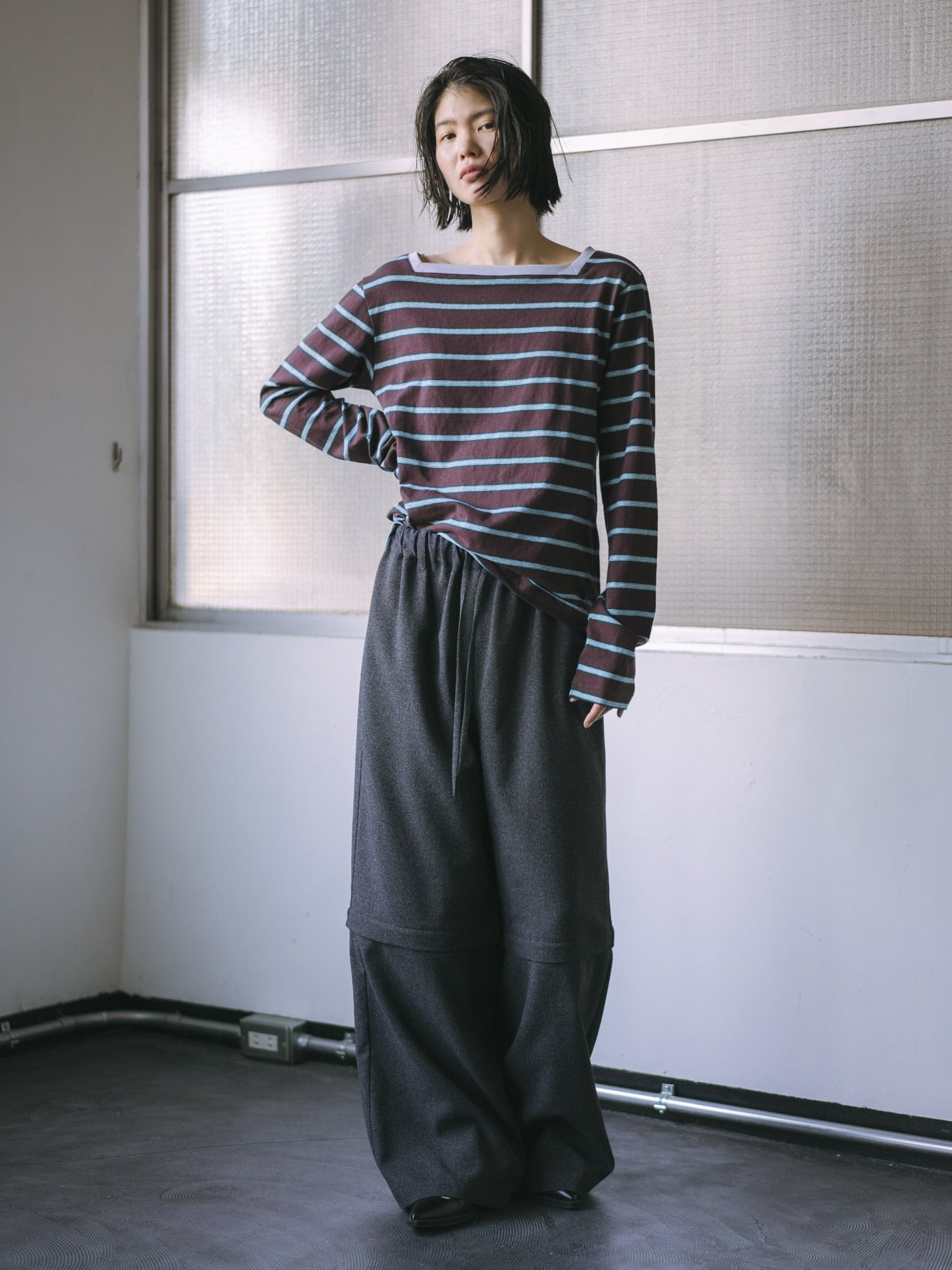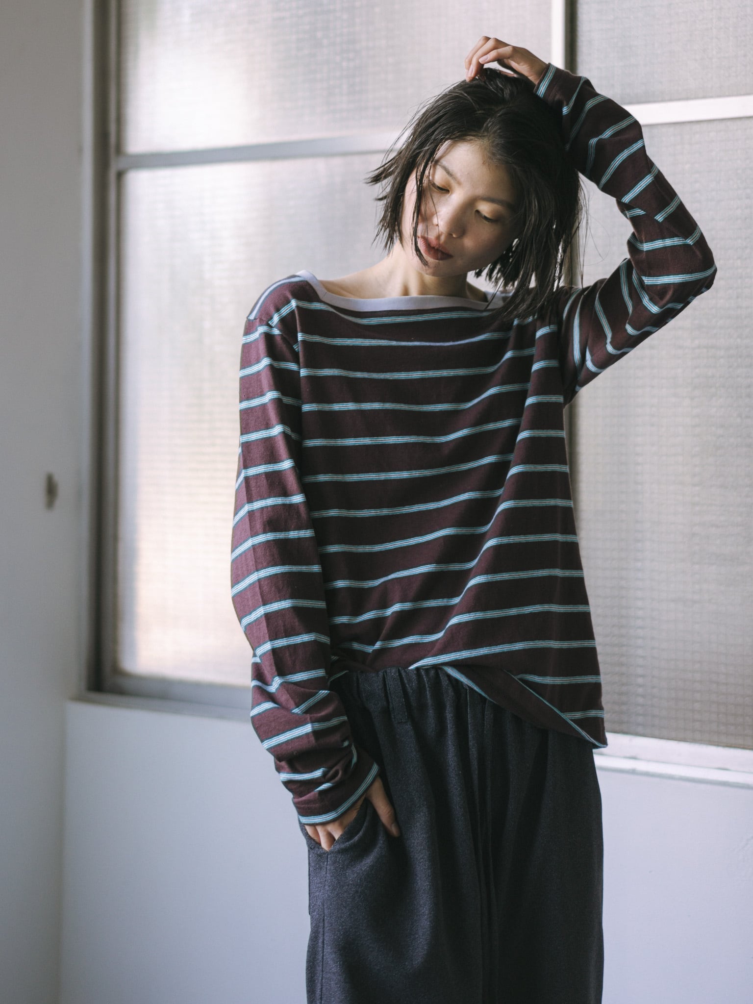 beigeベースのマルチボーダーには襟ぐりをcharcoal grayの配色に