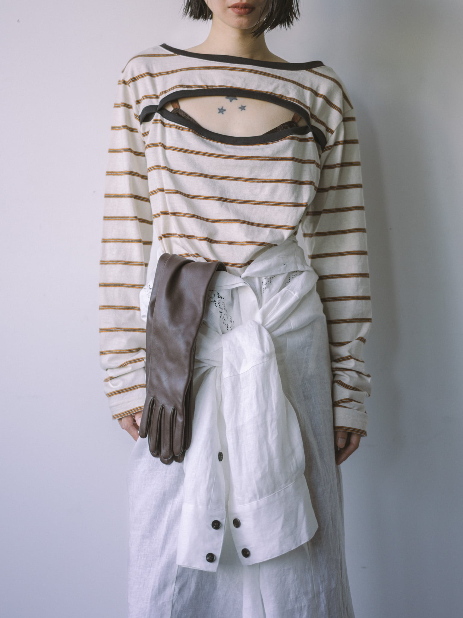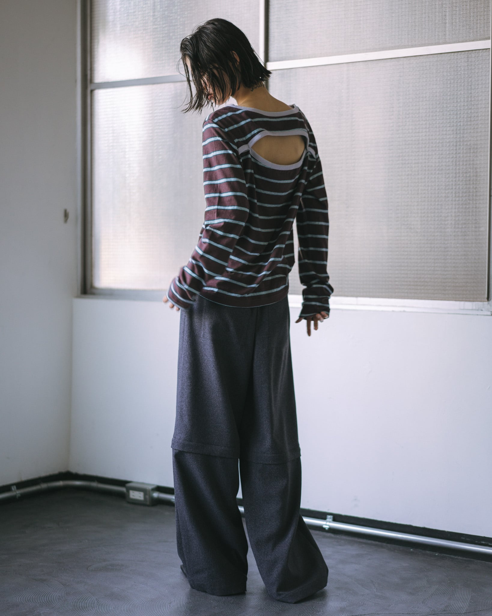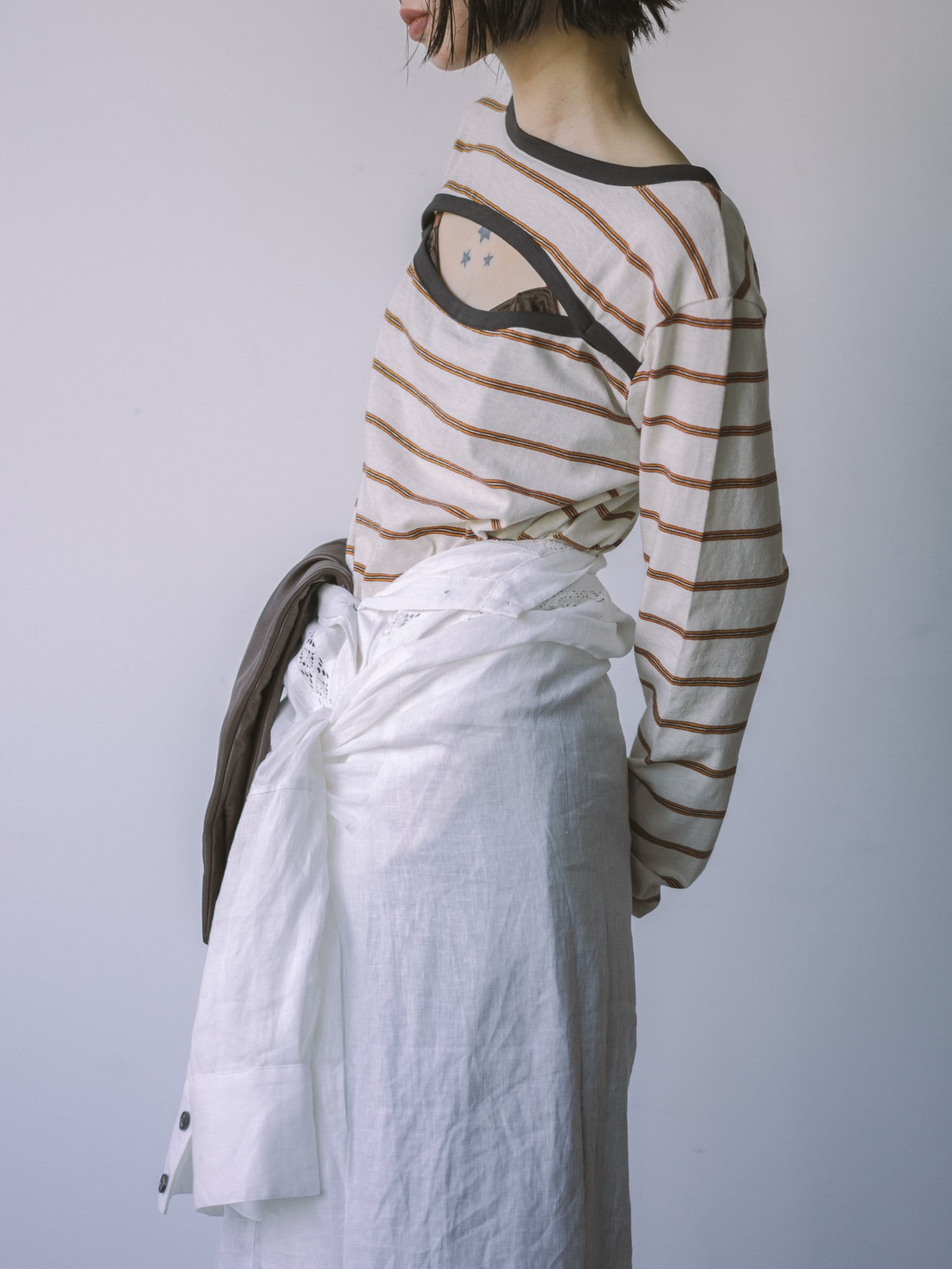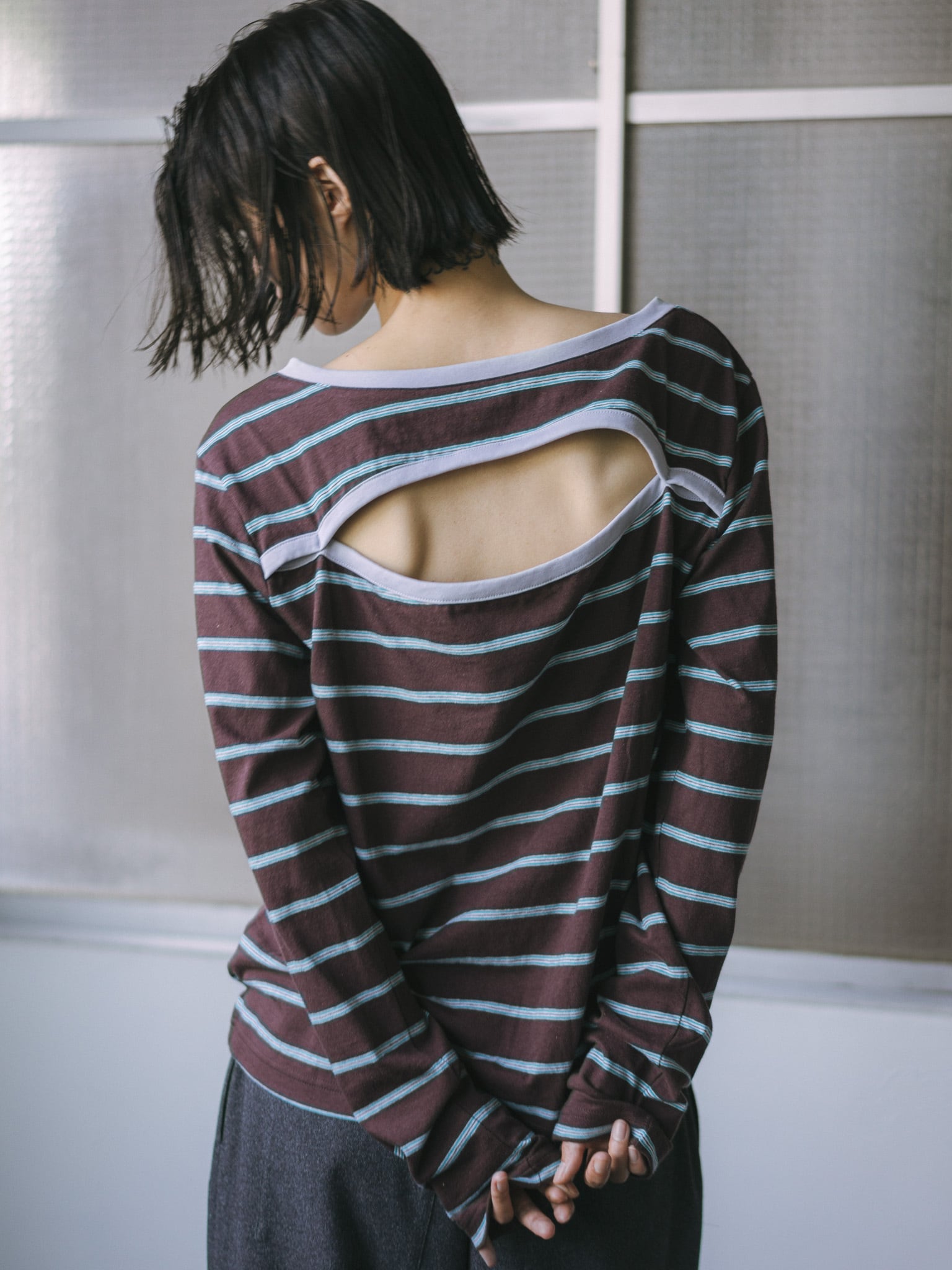 前後で着用でき、スクエアネック面とボートネック面には胸元に空きがあり2wayでお楽しみ頂けます。