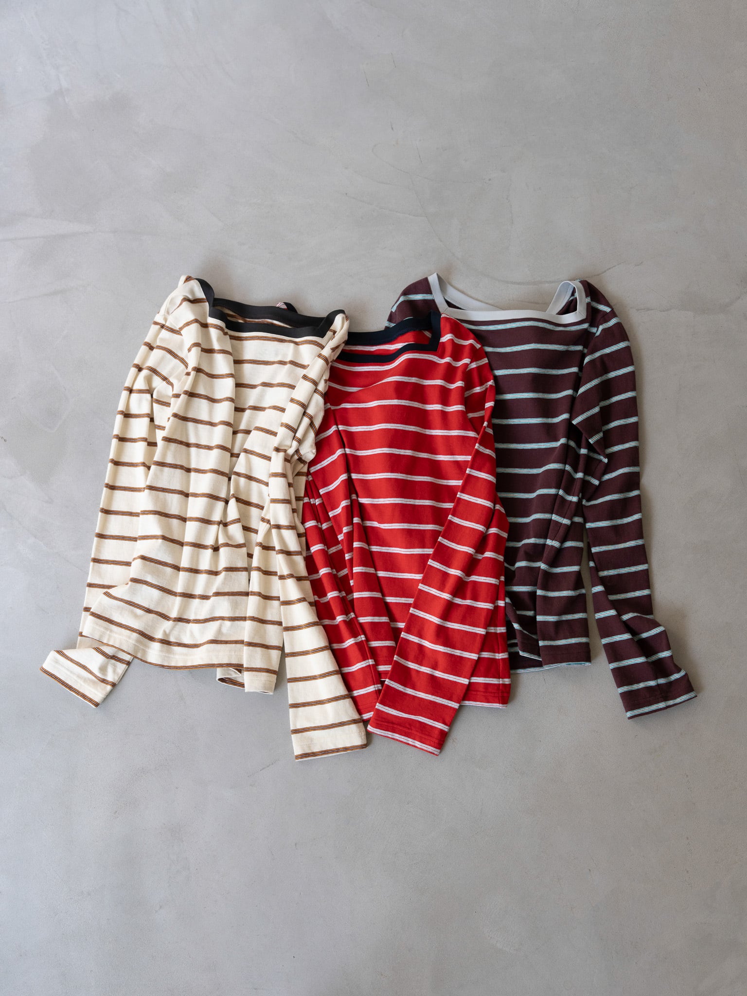purpleベースのマルチボーダーには襟ぐりをsaxの配色の3色展開になります。
