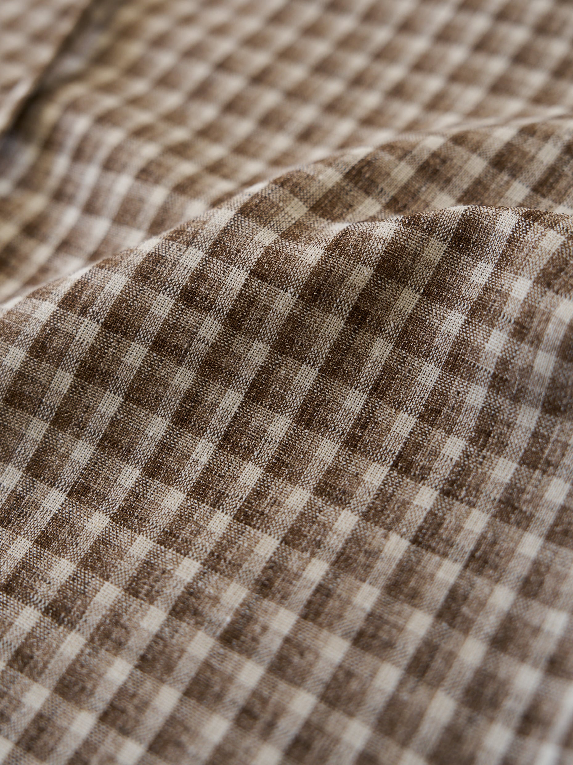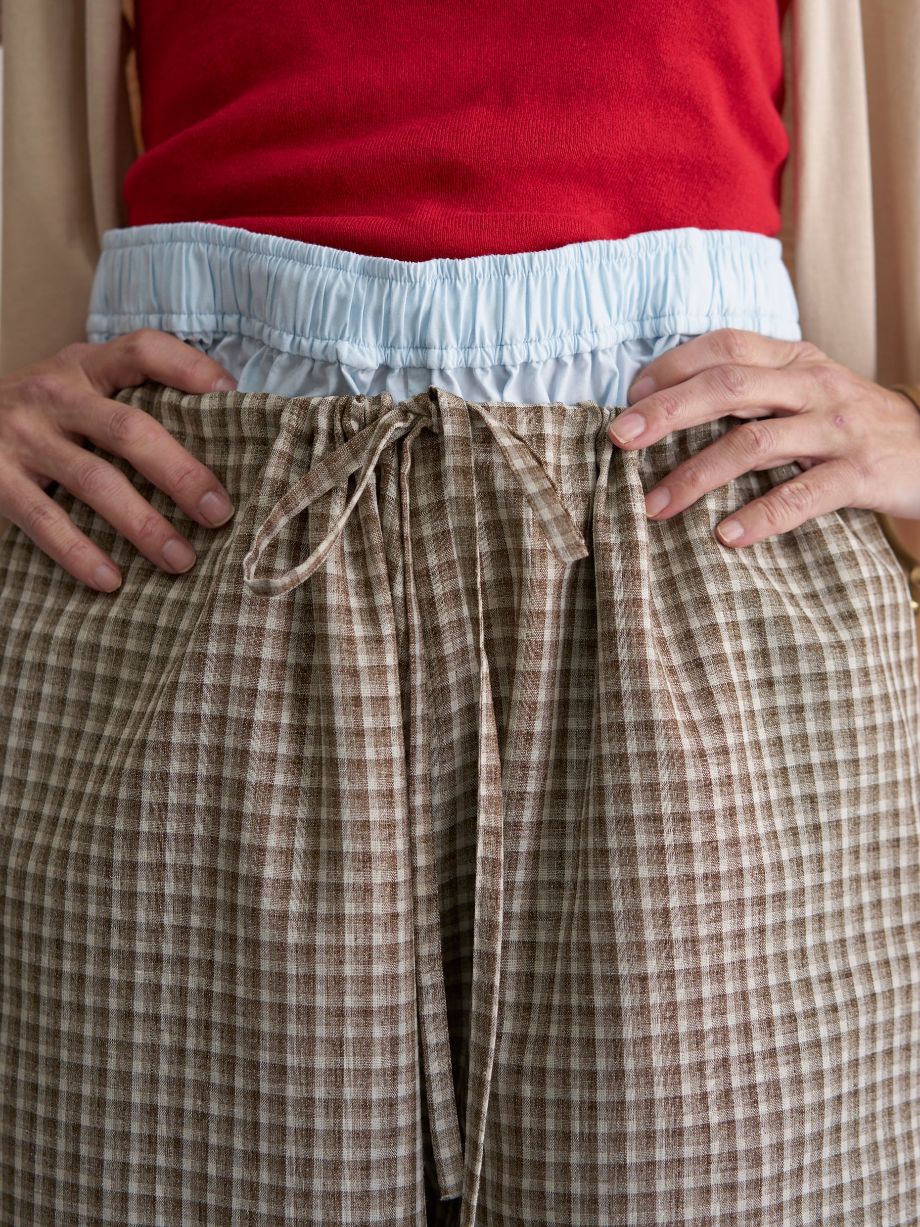 一目惚れした国産のギンガムチックなチェック柄の生地を選びましたインナーパンツがセットになったウエストが紐で調節出来るイージーパンツです。