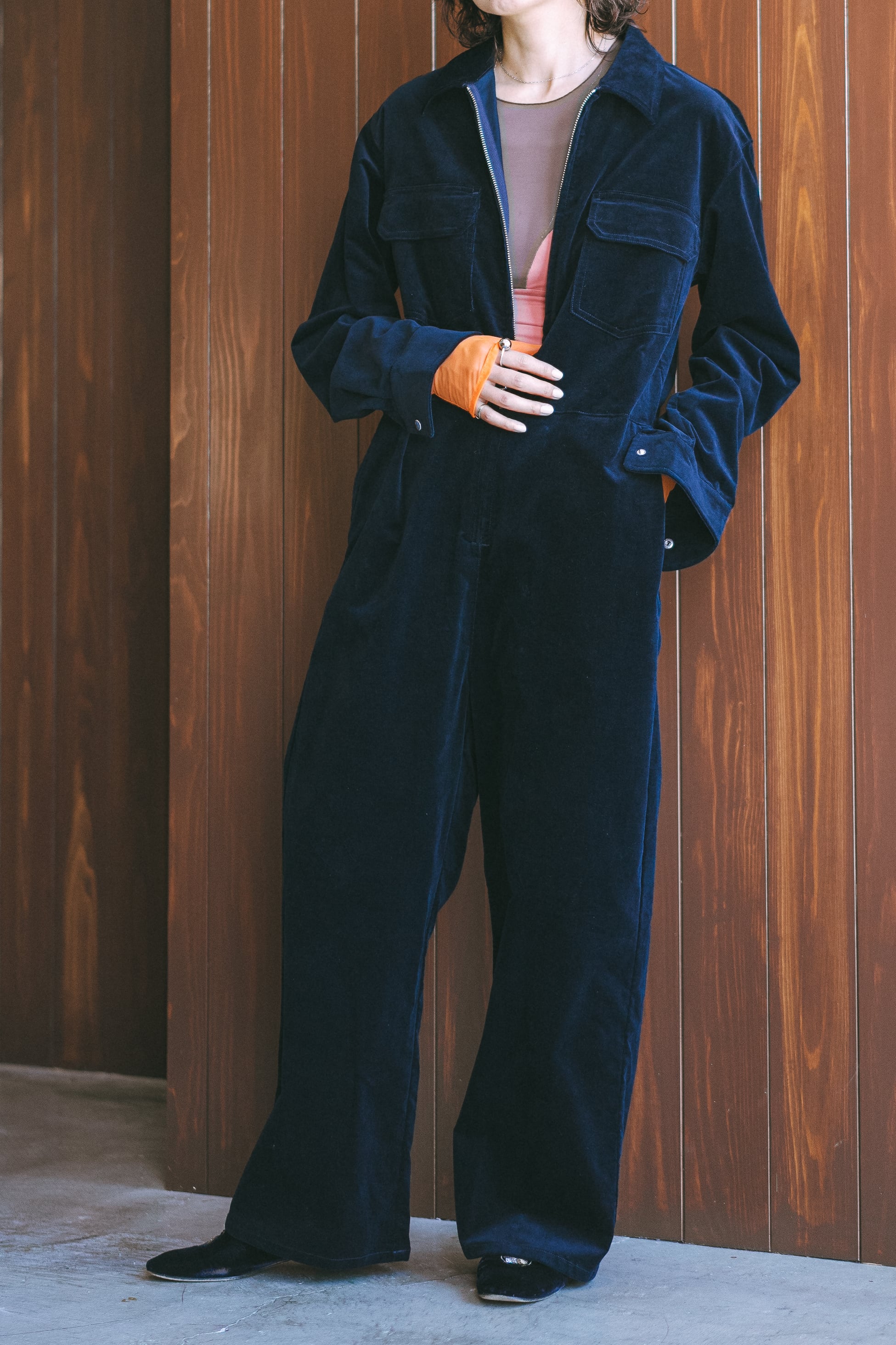 シンプルなデザインはそのままにカジュアルな印象のジャンプスーツを別珍素材でモードな雰囲気でも着て頂けます。