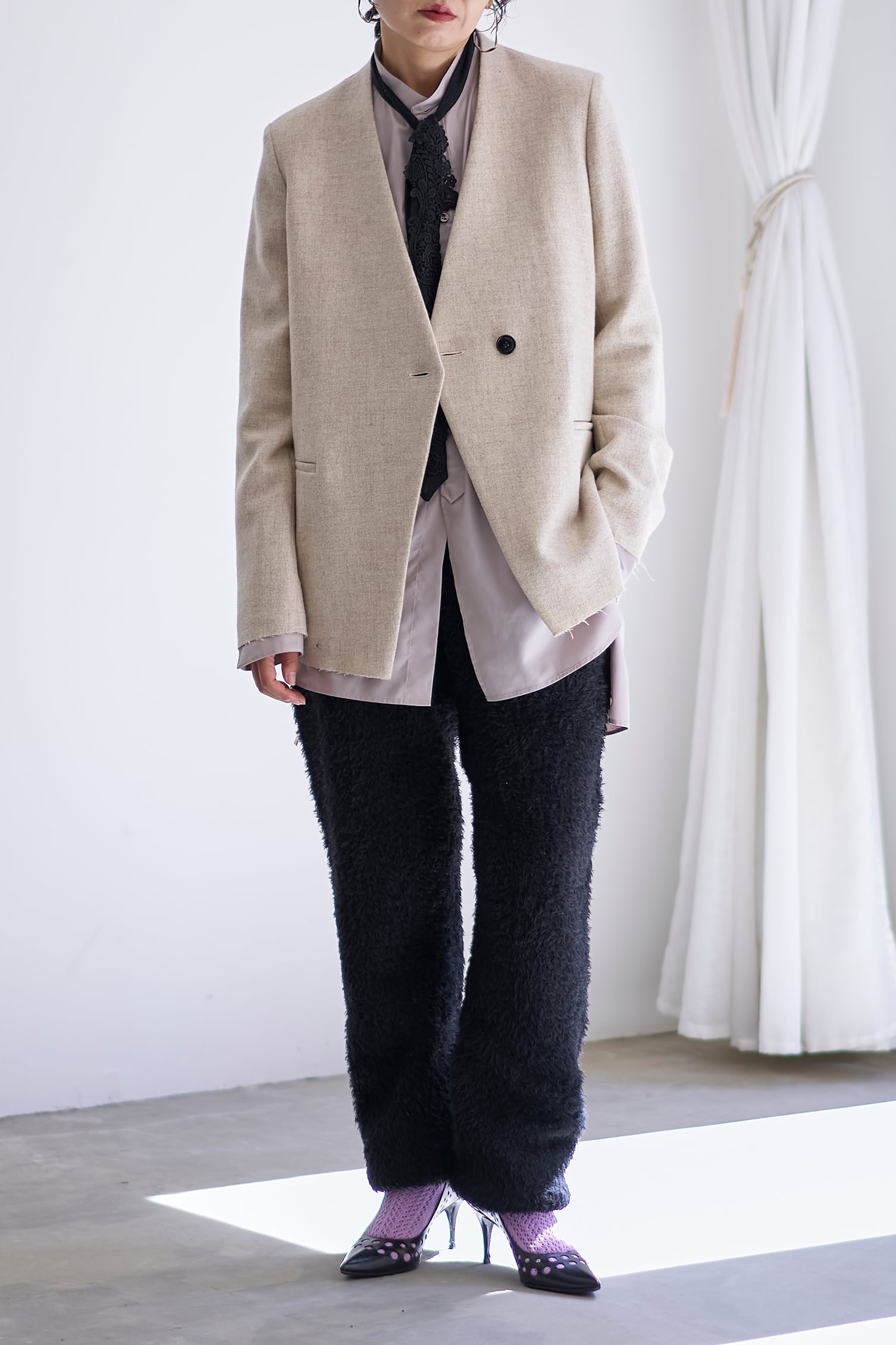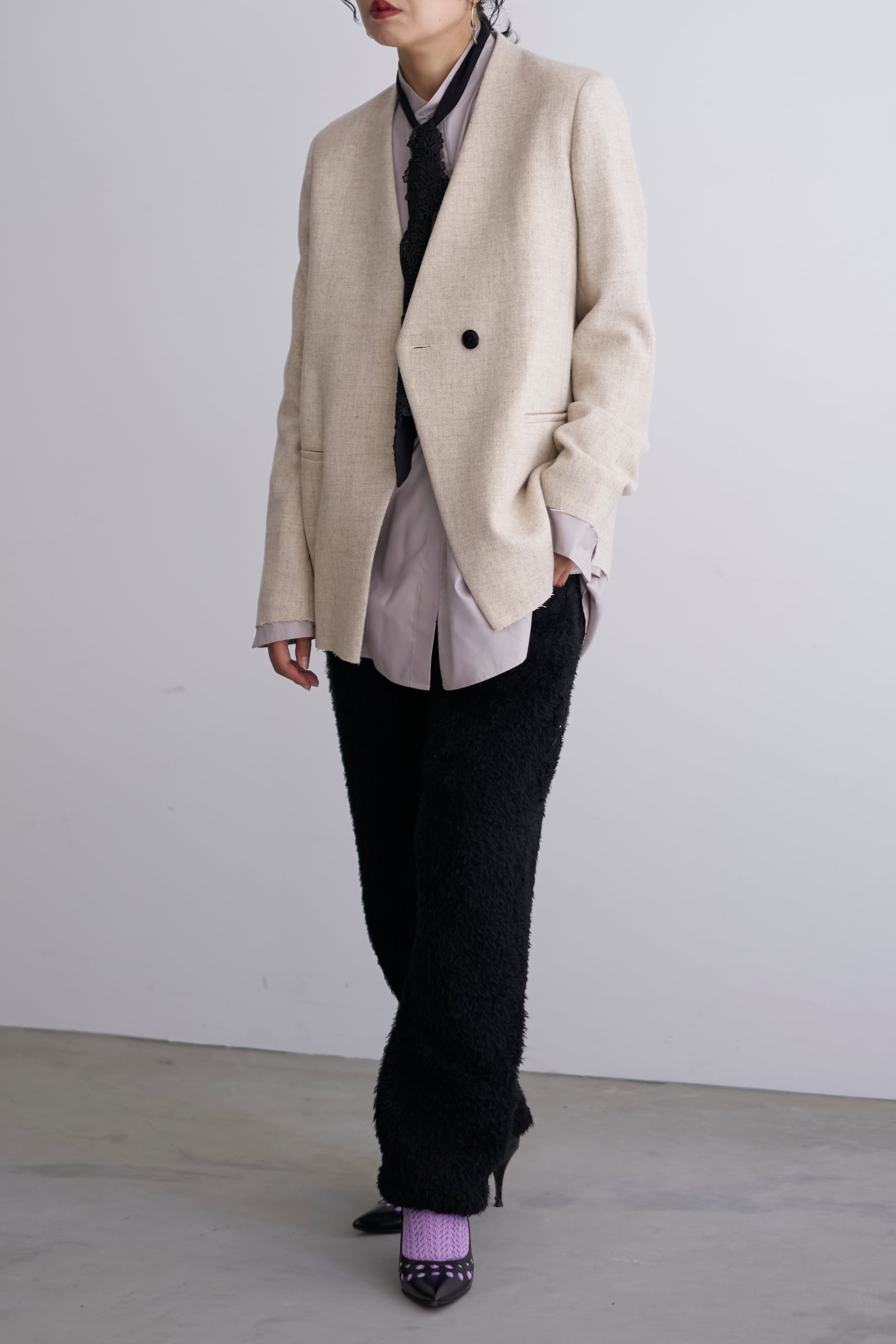この糸は芯がポリエステル、そこにファーに見えるように毛羽立たせたwoolの糸を巻くという、かなり特殊な紡績方法で作られた糸で、