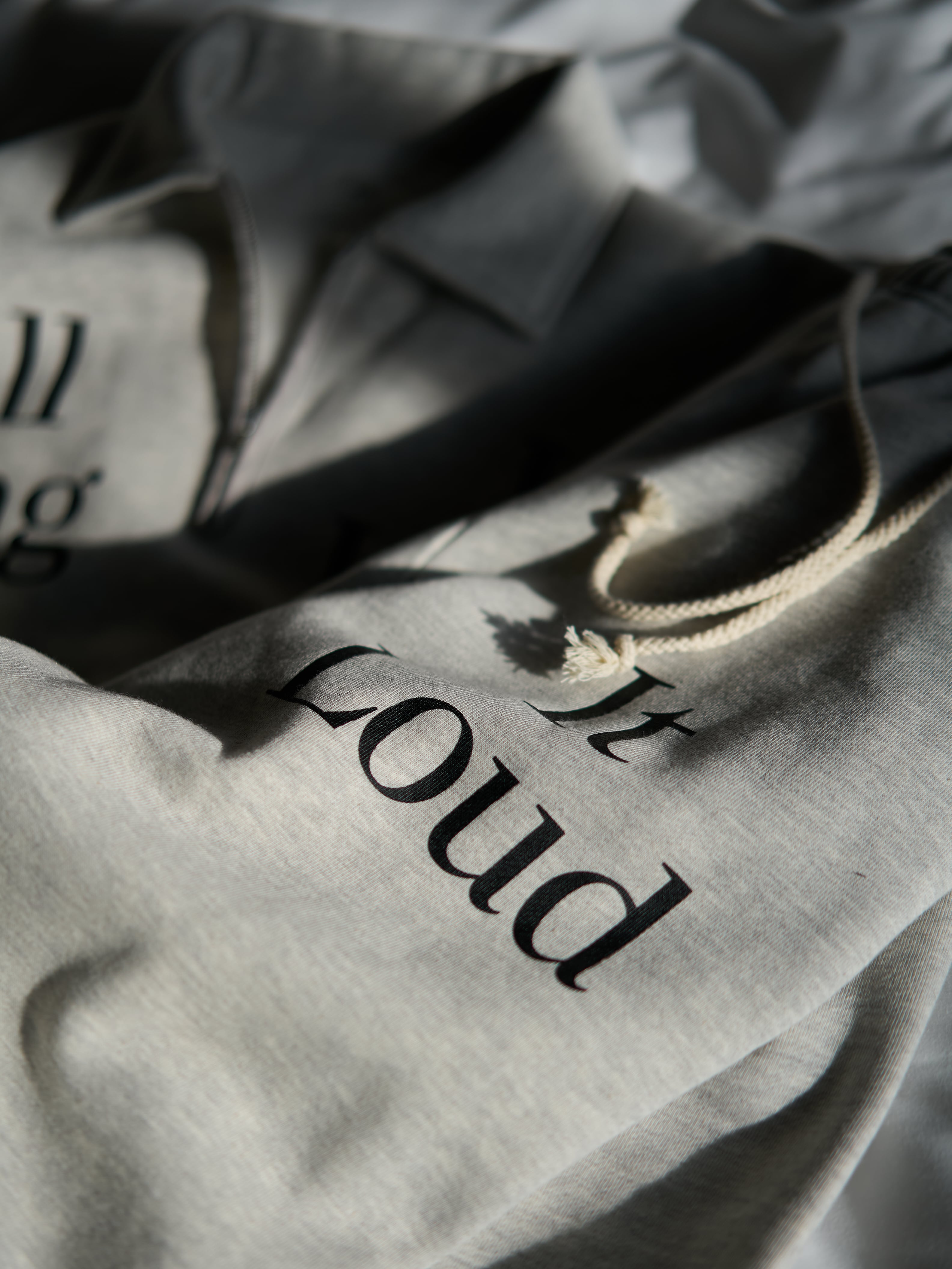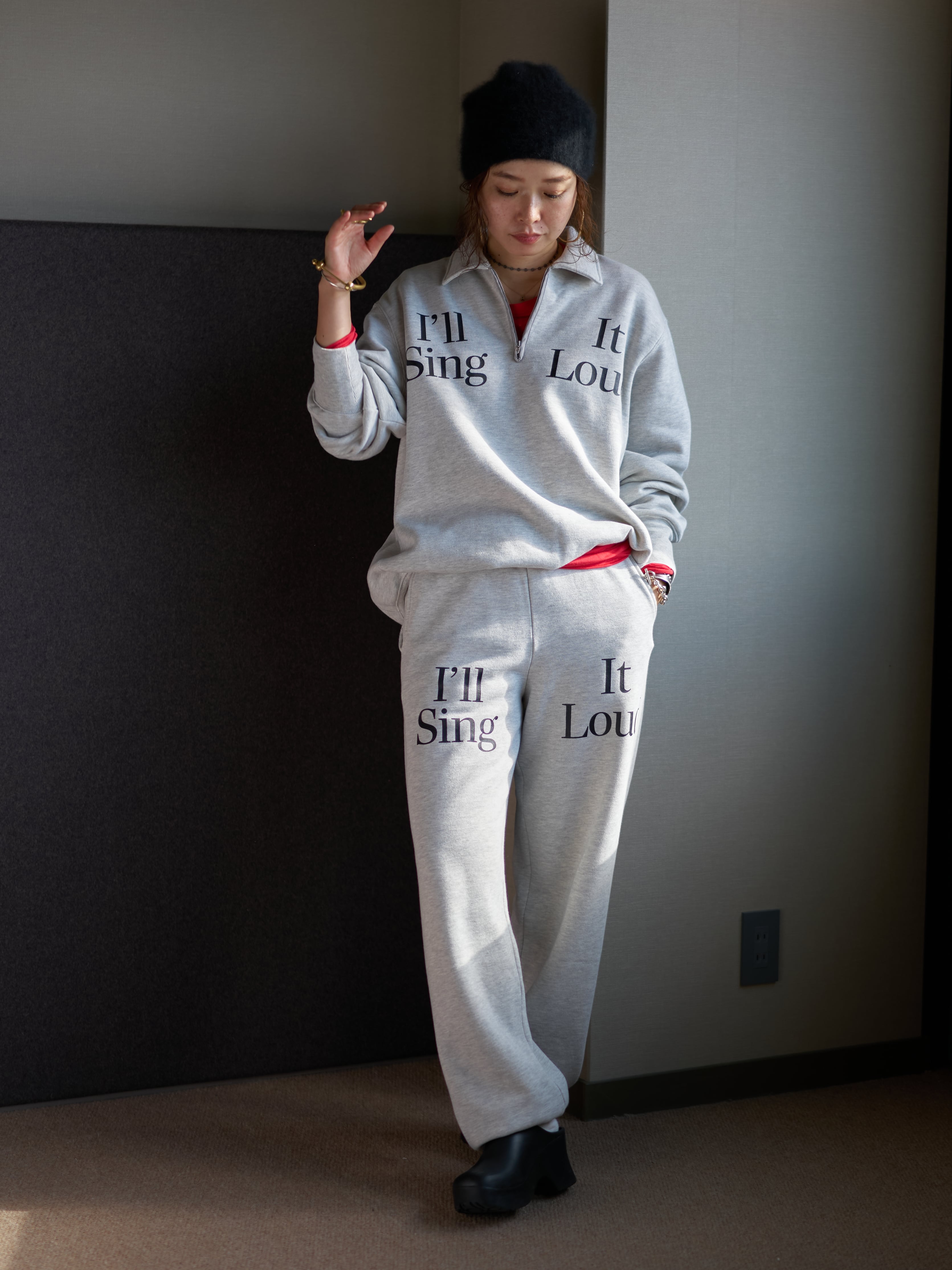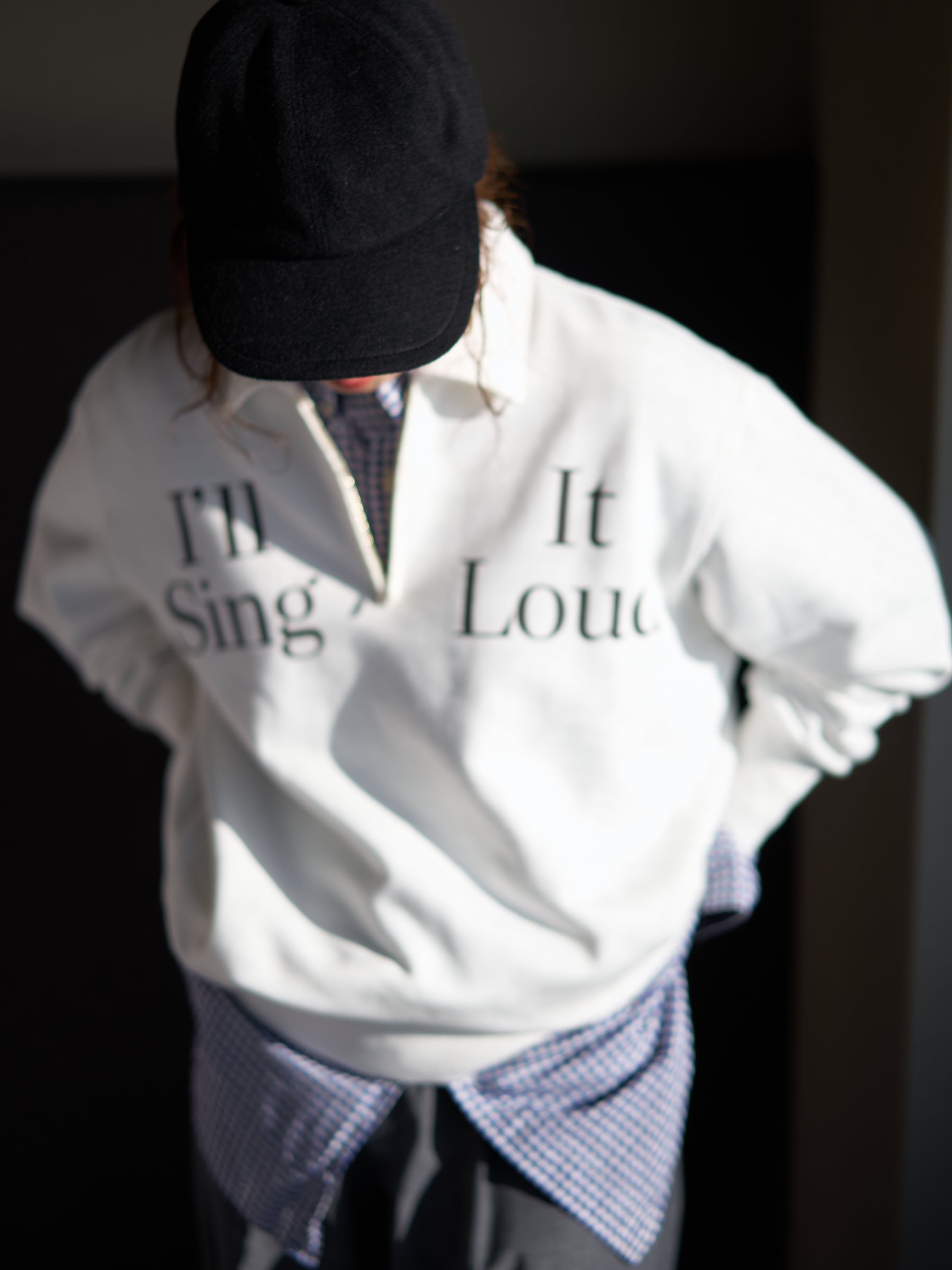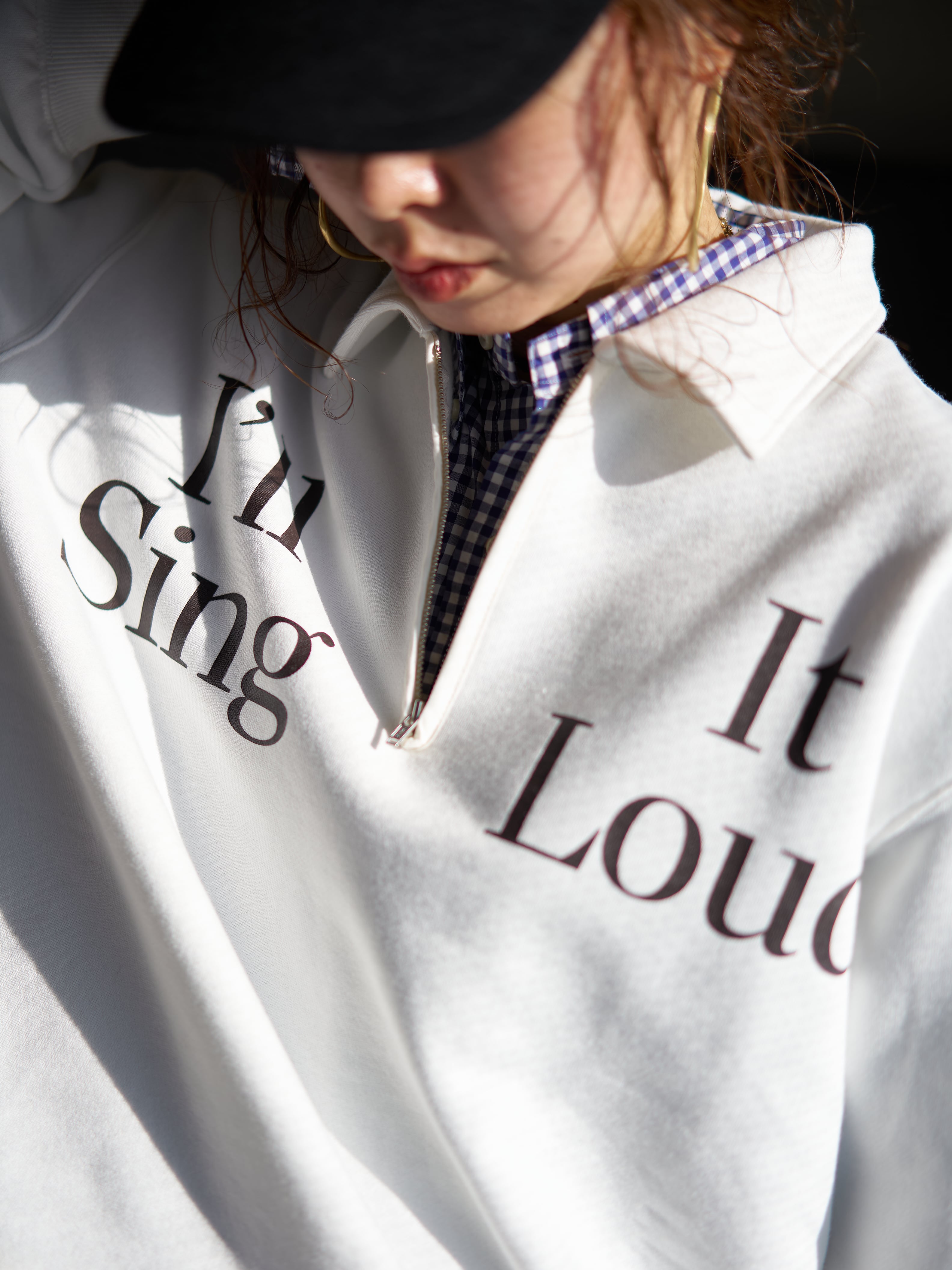 胸元に入ったロゴは大好きな映画の挿入歌の歌詞から" I'll Sing It Loud " という部分をとりました。とても暗いシーンなのですが、大声で歌うよと自分を奮い立たせて歌う主人公がとても印象的で、心に響いたシーンのこの言葉を両胸に入れました。