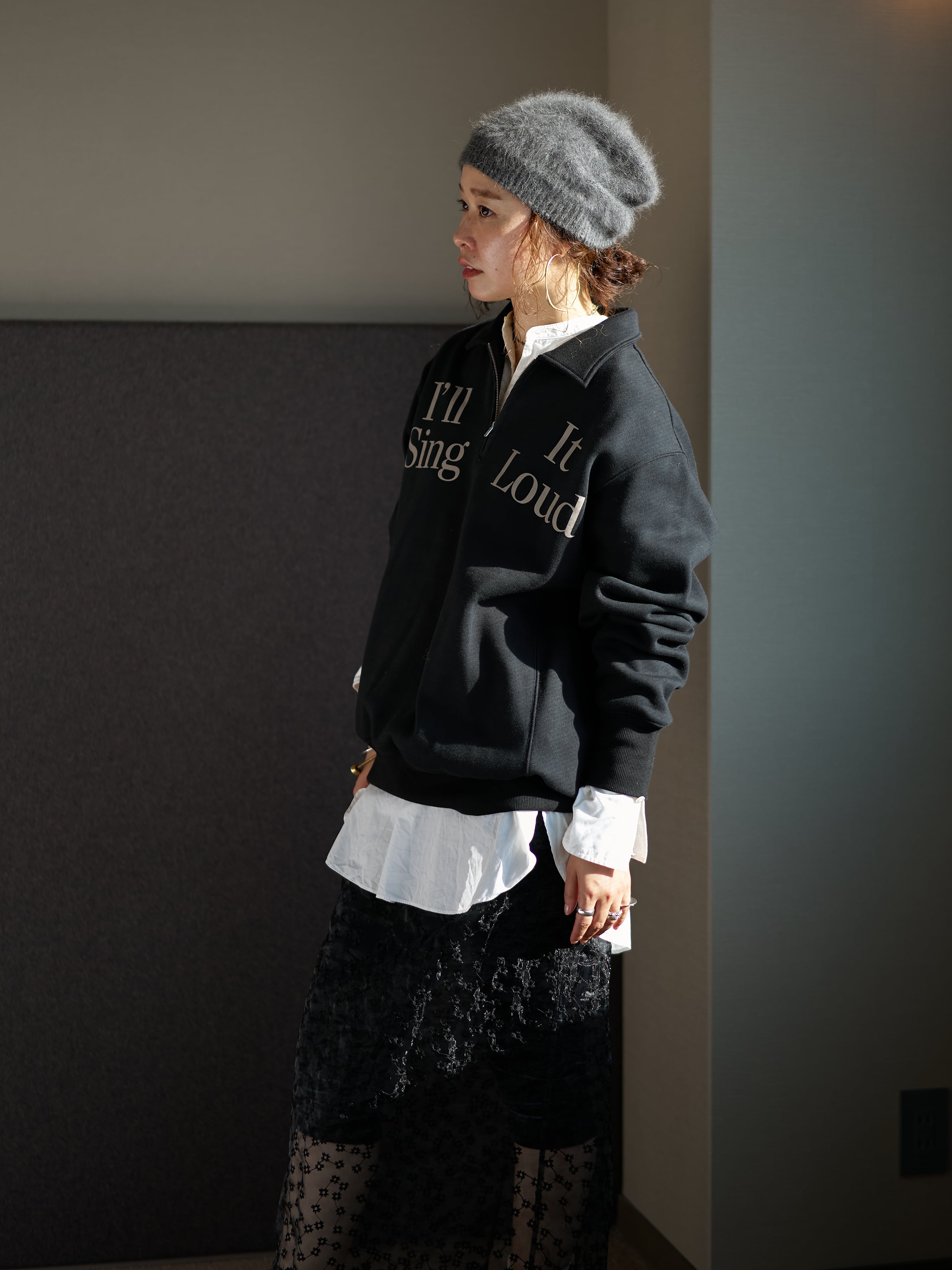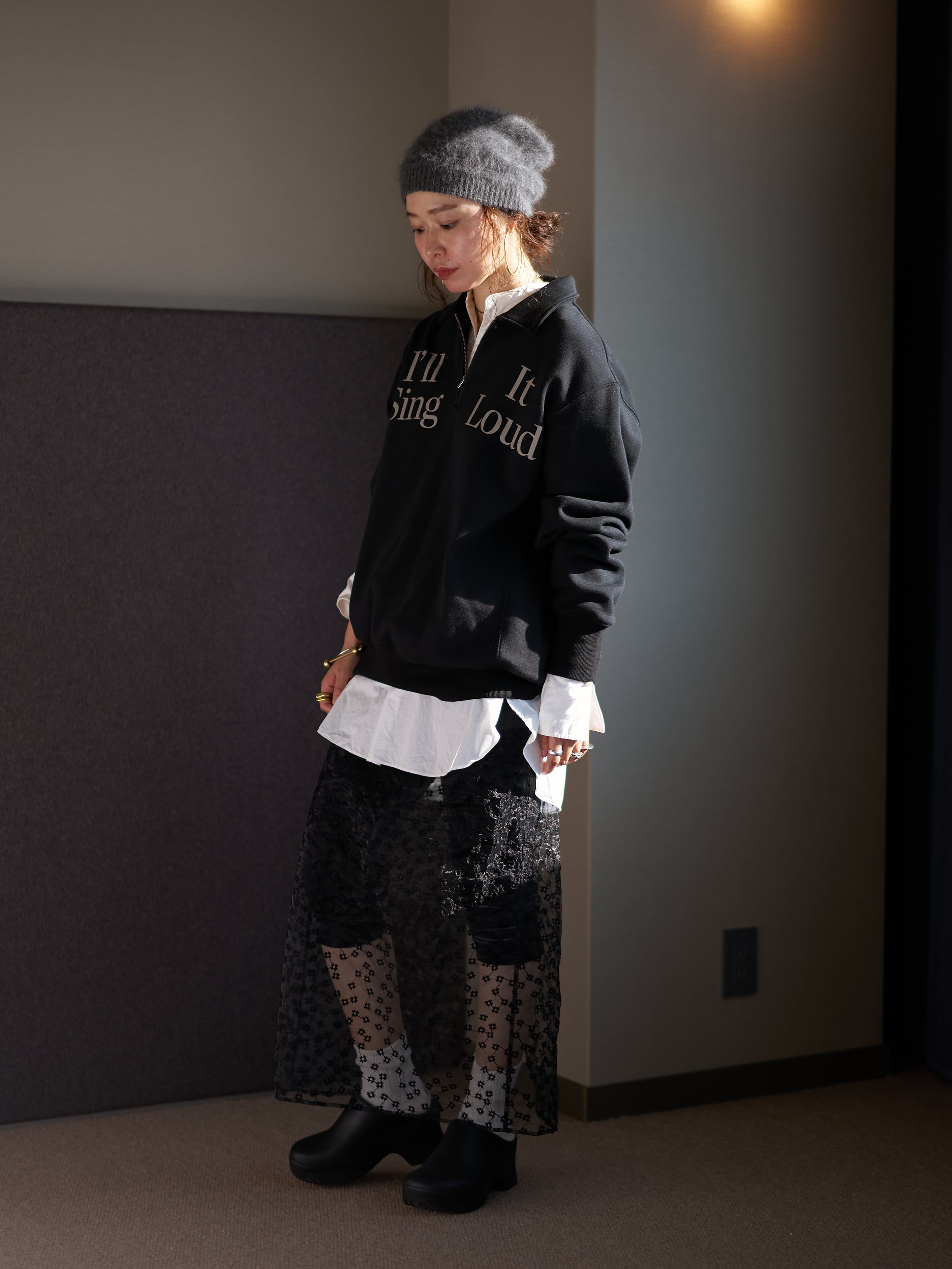 裏起毛のスウェット生地を使用したトップスです。肉厚で柔らかい裏起毛の素材はニットの代わりに着て頂ける暖かさです。
